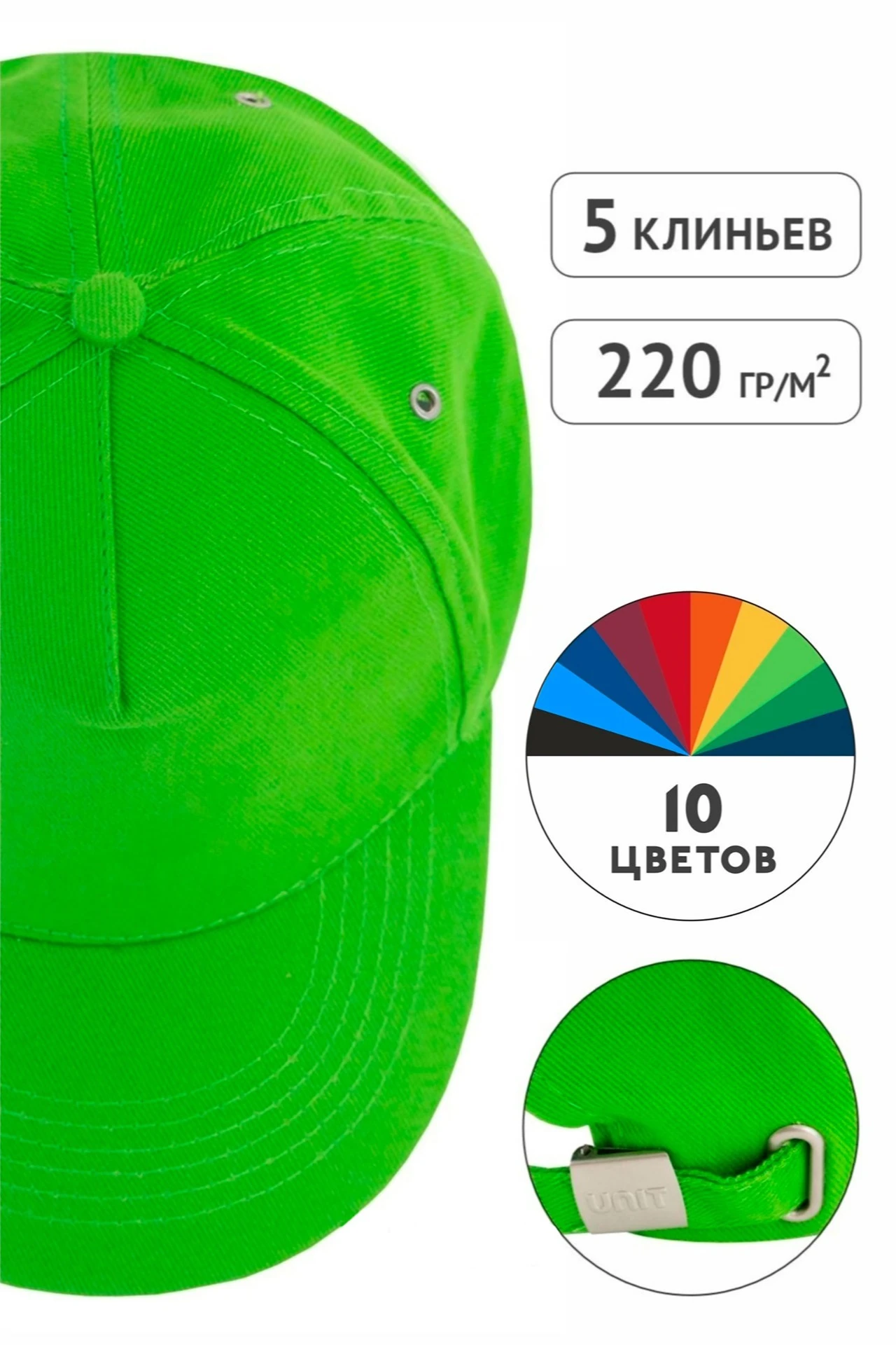 Модель. Купол бейсболки состоит из пяти клиньев. Металлическая застежка для регулировки размера.