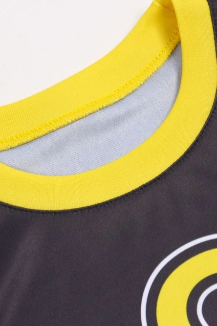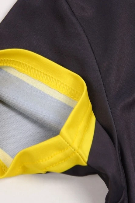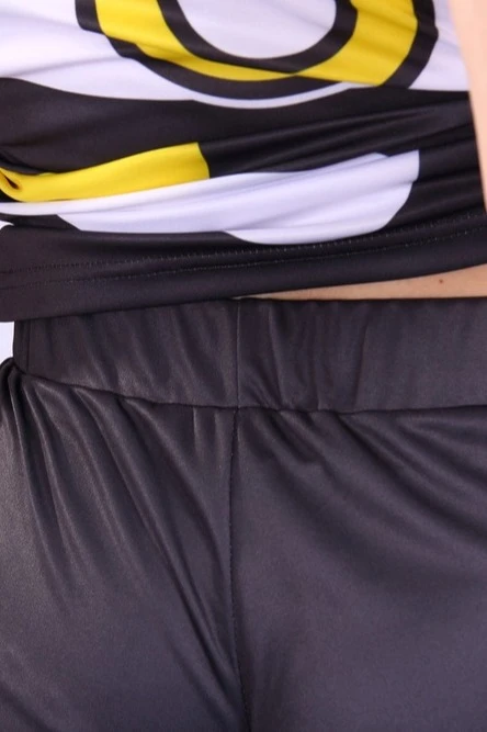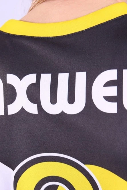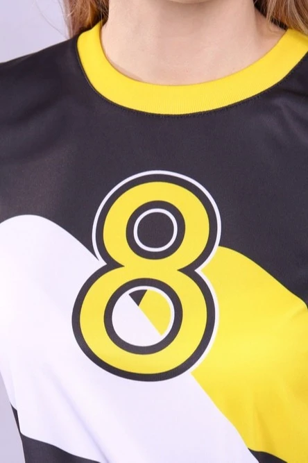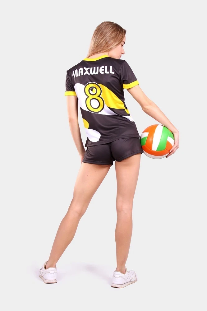 В этом варианте женской волейбольной формы Хэнди удачно использованы три контрастных цвета – желтый, черный и белый. Короткие черные шорты и приталенная футболка в трехцветной гамме выглядят стильно и спортивно. Трикотажная ткань «прима», из которой сшита форма, легкая и приятная при прикосновении, а также практичная: она способна выдерживать множественные тренировки и стирки, сохраняя все качественные характеристики и цвет. Номер, имя игрока, логотип и название команды и другие изображения мы наносим в процессе шитья методом сублимационной печати.
