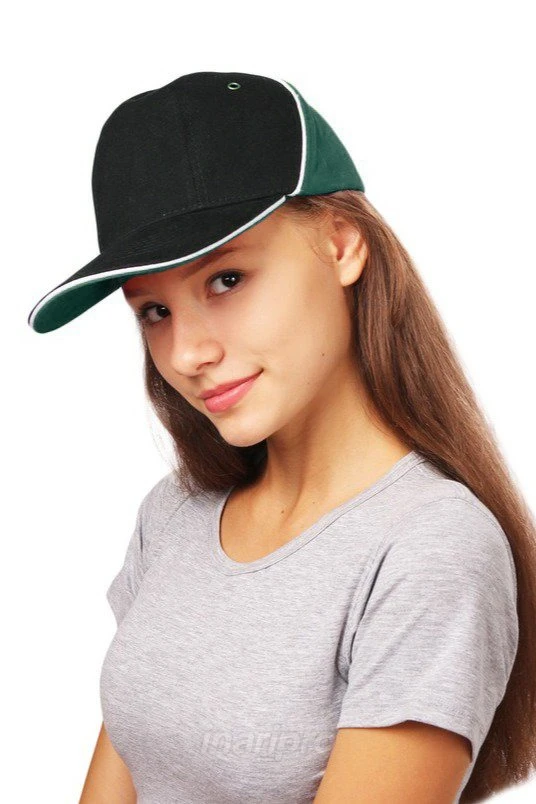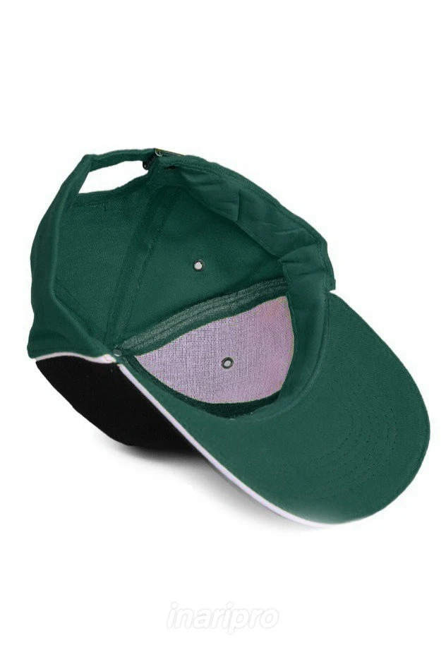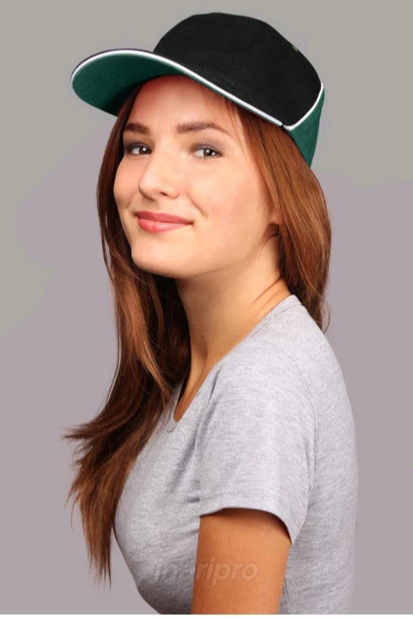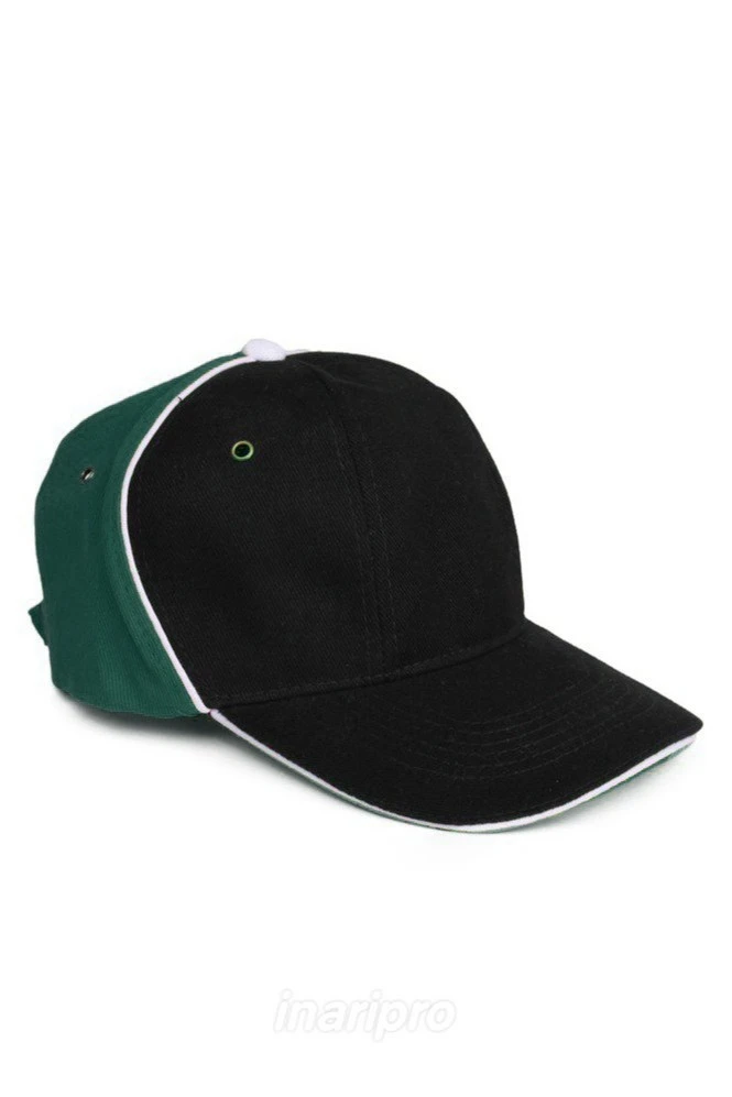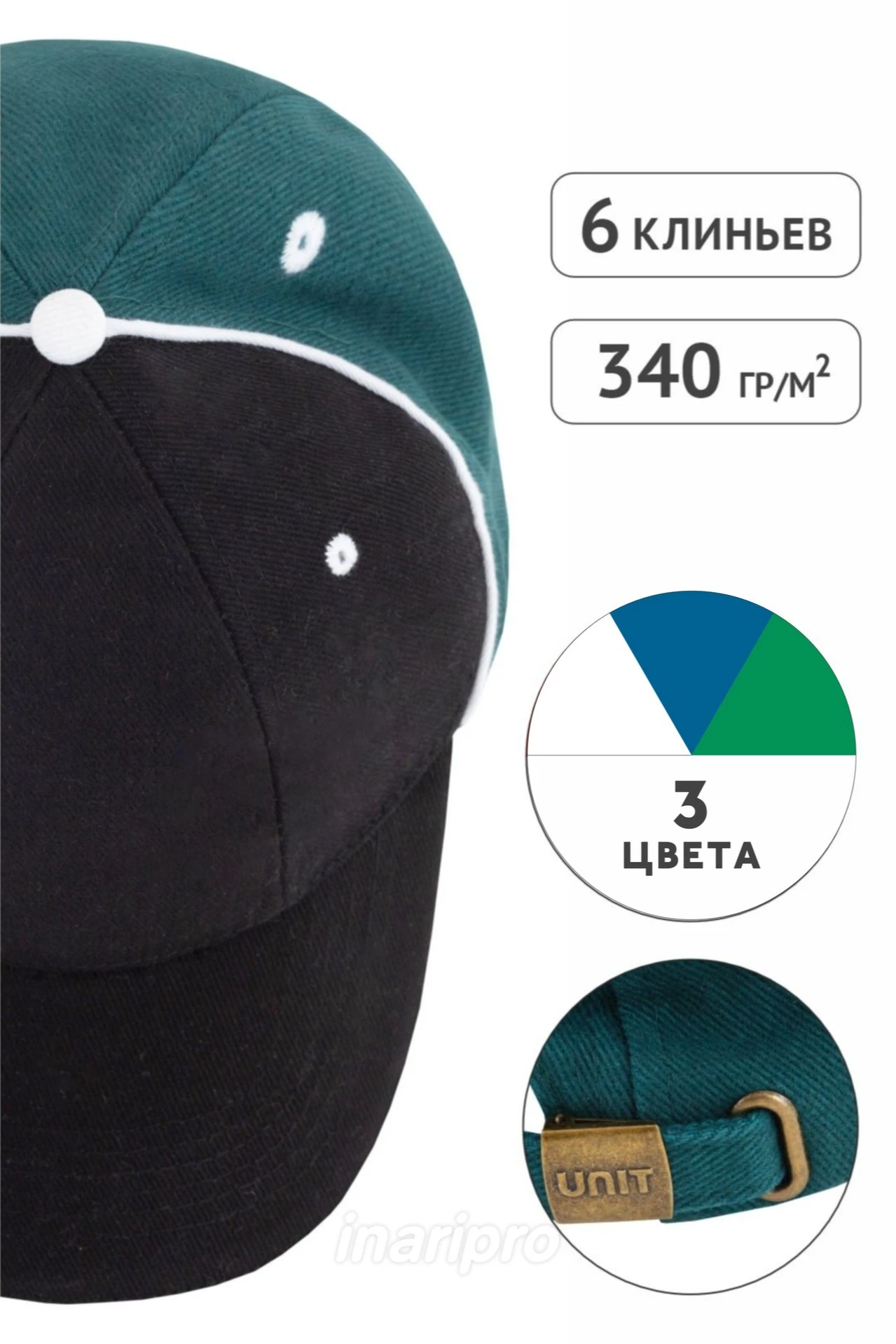 Модель. Купол бейсболки состоит из шести клиньев, без лобового шва. Вентиляционные отверстия с люверсами, либо обшиты нитками. Верхняя часть козырька и передняя часть бейсболки выполнены в черном цвете. Низ козырька и оставшаяся часть бейсболки – другого цвета. По краю козырька и линии пришива черных деталей - отделочный кант белого цвета. Металлическая застежка для регулировки размера.