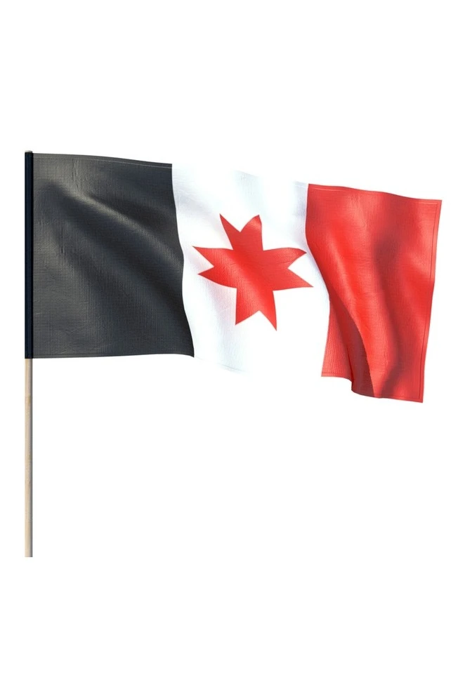 Описание. Государственный флаг Удмуртской Республики представляет собой прямоугольное трёхцветное полотнище с эмблемой, состоящее из вертикальных равновеликих по ширине полос чёрного, белого и красного цвета. Соотношение ширины флага к его длине 1:2. В центре белой полосы изображён восьмиконечный солярный знак красного цвета, не касающийся полос чёрного и красного цветов, вписывающийся в квадрат, сторона которого равна 5/6 ширины одной из равновеликих полос флага. Ширина вертикальной и горизонтальной полос, составляющих солярный знак, равна 1/3 стороны квадрата. Каждая полоса завершается двумя симметричными зубцами, внутренние стороны которых образуют угол в 90 градусов с вершиной, углублённой к центру знака на 1/2 ширины полосы. Автор флага - Юрий Лобанов.