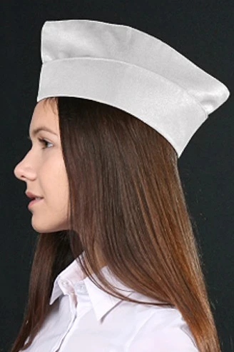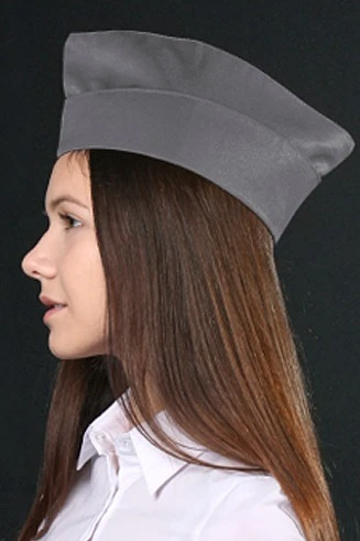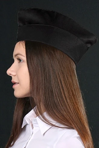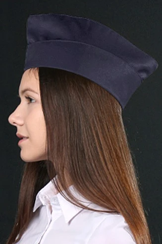 Модель. Пилотка фигурная с отворотом. Высота отворота на передней части пилотки составляет 5 см, на задней части 7 см. Пилотка с подкладом из шелка расцвечивания.