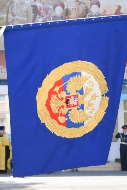 На оборотной стороне полотнища – надпись золотистыми славянскими литерами в четыре строки: «ЛУЧШЕМУ КАЗАЧЬЕМУ КАДЕТСКОМУ КОРПУСУ».