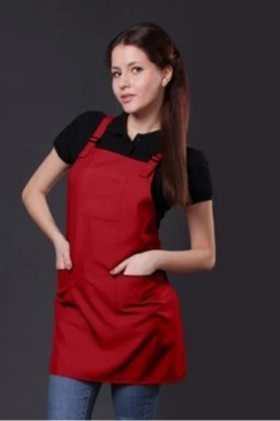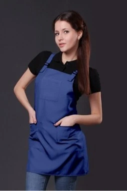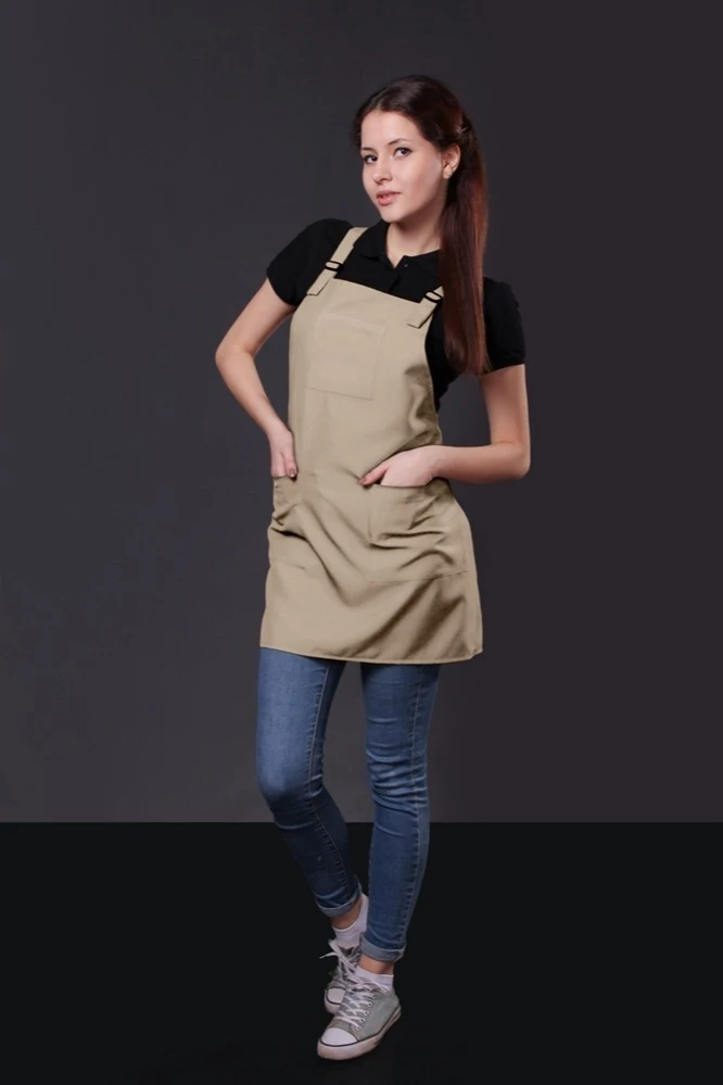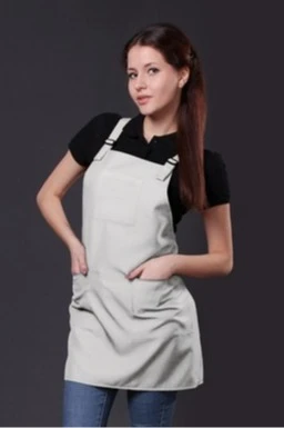 Модель: Фартук фигурной формы без разреза. Фартук по периметру обработан швом вподгибку. Фартук может быть изготовлен с одним карманом 18х70 см, разделенным на 6 отсеков, либо с тремя карманами: два боковых 18х20 см и один карман на груди 13х12 см. Креплением служат перекрещивающиеся на спине лямки. Лямки из основной ткани фиксируются на груди с помощью двух пластиковых регуляторов черного цвета. В районе пояса лямки продеваются через два никелированных люверса диаметром 15 мм.