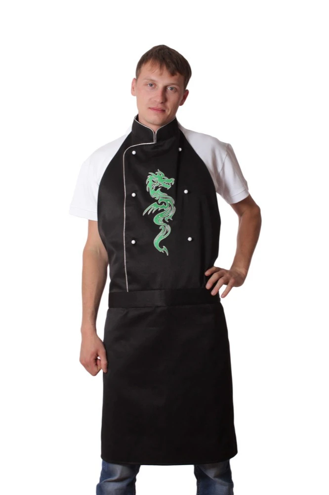 Модель: Фартук фигурной формы без разреза и карманов. За дополнительную плату фартук может быть пошит с одним карманом 20х35 см, либо двумя карманами 17х20 см. Фартук по периметру обработан швом вподгибку. Воротник и пояс выполнены из основной ткани. Воротник на липе. На груди выполнен запа́х, обшитый кантом золотого или серебряного цветов. Установлены поварские пукли белого цвета (6 шт). За дополнительную плату фартук может быть удлинен до 15 см.