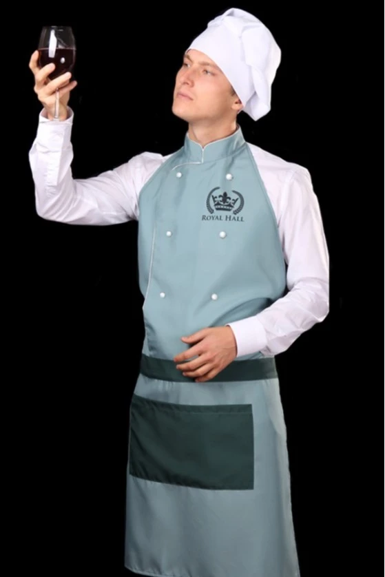Модель: Фартук фигурной формы без разреза и карманов. За дополнительную плату фартук может быть пошит с одним карманом 20х35 см, либо двумя карманами 17х20 см. Фартук по периметру обработан швом вподгибку. Воротник и пояс выполнены из основной ткани. Воротник на липе. На груди выполнен запа́х, обшитый кантом золотого или серебряного цветов. Установлены поварские пукли белого цвета (6 шт). За дополнительную плату фартук может быть удлинен до 15 см.