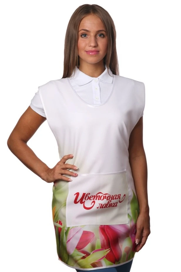 Модель: Накидка фигурной формы с одним карманом 20х25 см. За дополнительную плату фартук-накидка может быть пошита с двумя карманами 13х16 см. Края и горловина фартука обрабатываются косой бейкой стандартных цветов. Завязки длиной 50 см, выполнены из косой бейки.