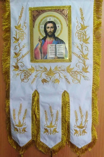 Хоругвь Православной Церкви с образом Спаса Вседержителя применяется на богослужениях и в праздничном божественном шествии. Отождествляет победу Церкви Христовой. Хоругвь сделана из белого сатена и украшена золотистой вышивкой и длинной бахромой по краям.