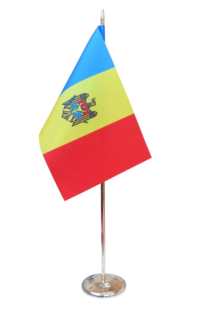 Описание. Флаг Молдовы представляет собой триколор из синего, желтого, и красного цветов, вертикально расположенных слева направо. Посередине флага, на желтой полосе, изображен герб Молдовы, который представляет собой орла, держащего герб на груди, крест в клюве, оливковую ветвь в правых когтях, и скипетр в левых когтях. На щите изображена декорированная голова зубра. Соотношение сторон во флаге Молдовы составляет 1 к 2.