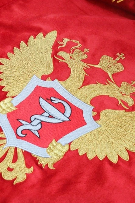 Позолоченный герб России вышитый на красном, натуральном бархате выглядит шедеврально и роскошно. Как великолепно смотрится знамя, его можно преподнести важному лицу в качестве подарка. Любой отметит роскошь, с которой до мельчайших деталей продумано и изготовлено данное полотно. Всё знамя обшито тесьмой под золото, которая так безупречно перекликается с золотой вышивкой, которая в свою очередь придает полотну определенный шарм.