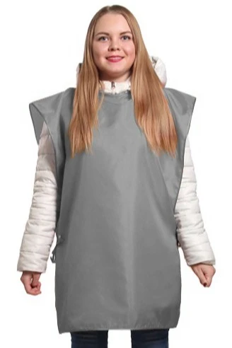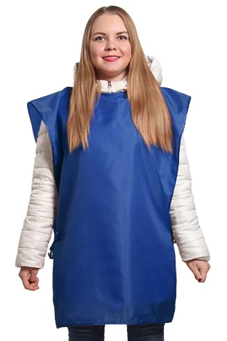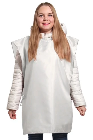 Модель: Накидка прямоугольной формы без карманов. Обработка края накидки швом вподгибку, горловина обрабатывается косой бейкой, завязки выполнены из брючной ленты белого или черного цветов, длиной 30 см.