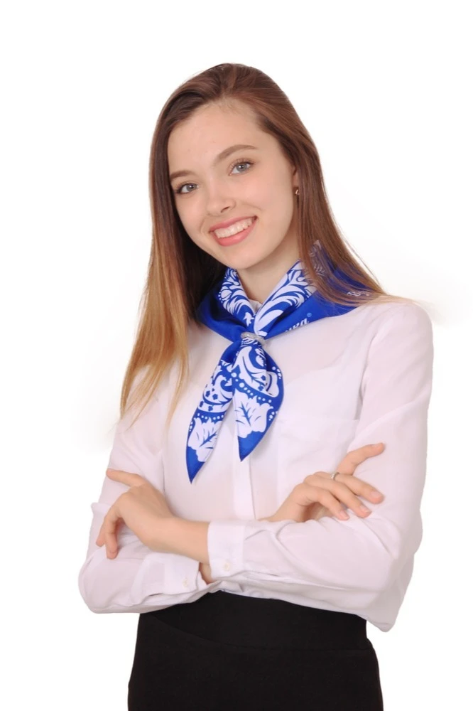 У вас есть возможно приобрести красивейший аксессуар, украшенный по вашему эскизу. Вы можете надеть его как на прогулку с друзьями, так и на работу, чтобы разбавить стандартный деловой костюм. Косынка имеет фигуру треугольника, что позволяет легко и быстро завязать бантик на шею и создать непринужденный образ.