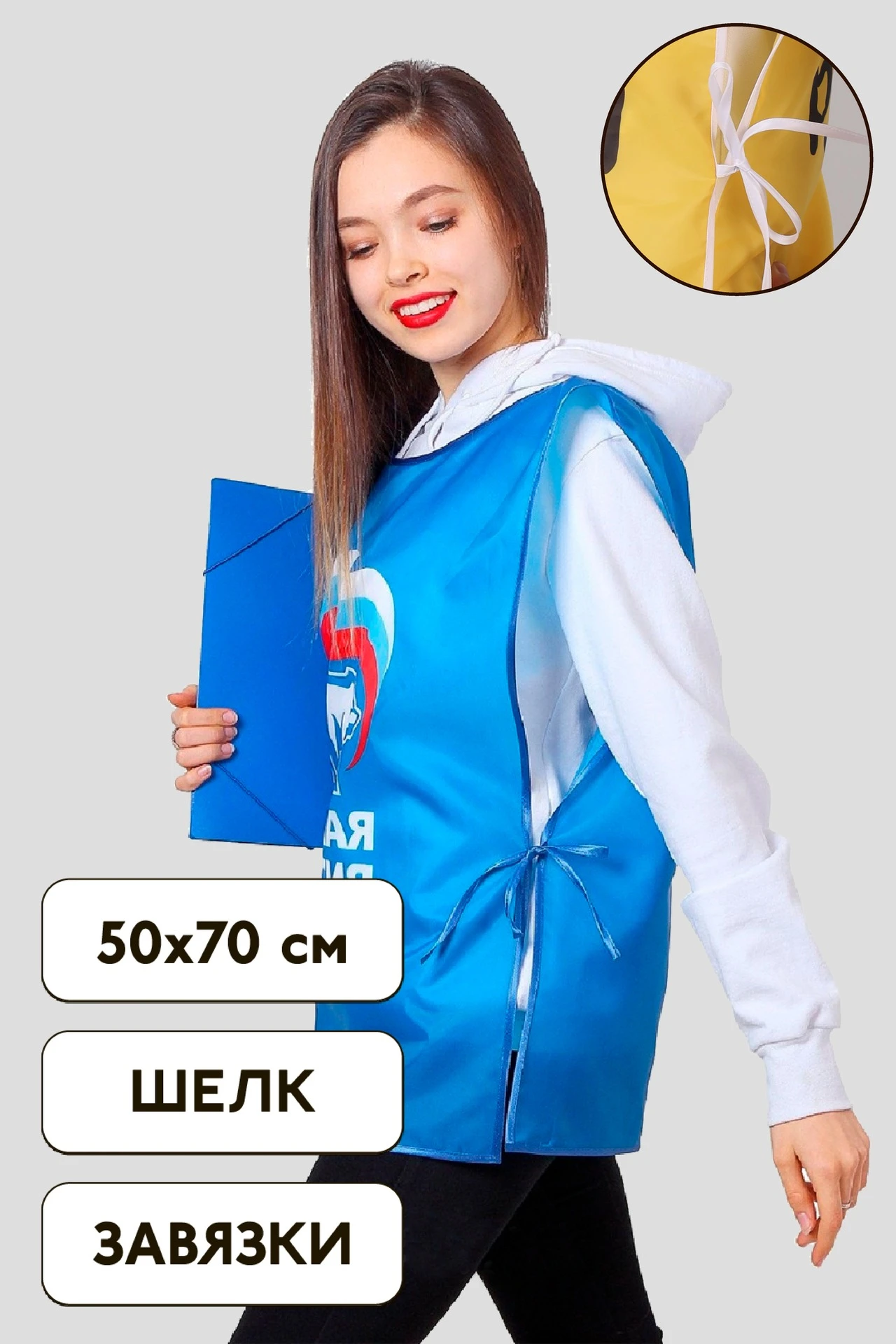 Накидка с полной запечаткой надевается поверх основной одежды, а по своей форме напоминает жилет. Такие изделия часто можно увидеть на промоутерах, раздающих рекламные листовки, и на интервьюерах, занимающихся проведением соцопросов. Приобретайте у нас накидки с нужными вам изображениями или надписями для своего персонала, контактирующего с людьми от лица вашей фирмы, общественной организации или политической партии.