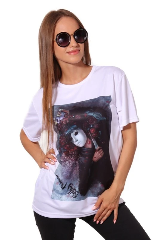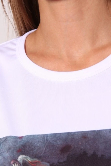 Модель. Прямой силуэт. Рукав короткий. Футболка имеет боковые швы без разрезов по низу изделия. Обработка горловины руликом (кантом) из основной ткани. Форма ворота О-образная.