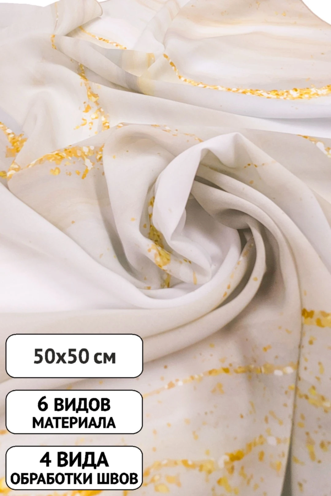 Модель: Платок квадратной формы. Края платка обрабатываются термоножом, ролевым швом, московским швом, швом по периметру с открытым срезом.
