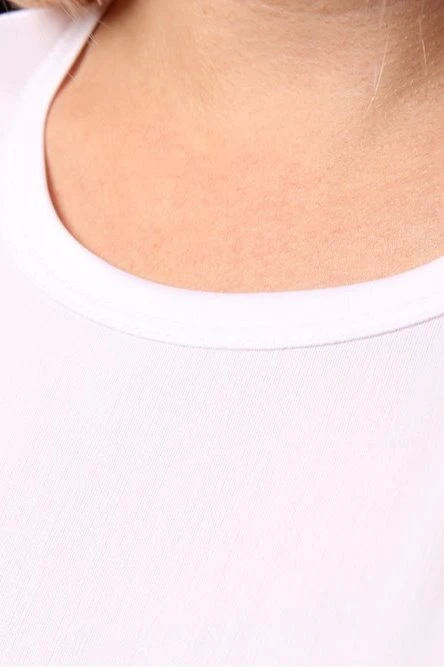 Модель. Прямой силуэт. Рукав короткий. Футболка имеет боковые швы без разрезов по низу изделия. Обработка горловины руликом (кантом) из основной ткани. Форма ворота О-образная.
