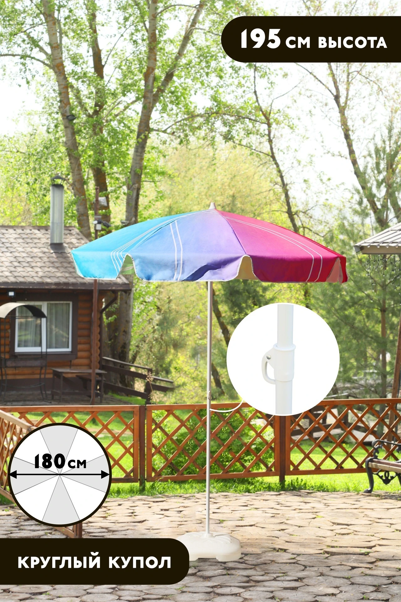 Модель: Конструкция зонта оснащена шарниром, благодаря которому возможно изменять угол наклона купола в зависимости от положения солнца.