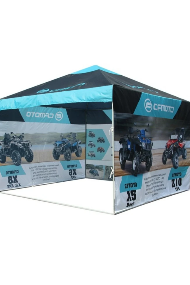 Сублимация. Полноцветная печать осуществляется на всей поверхности тента в процессе производства. Изображение располагается в соответствии с лекалом. Нанесение входит в стоимость шатра.