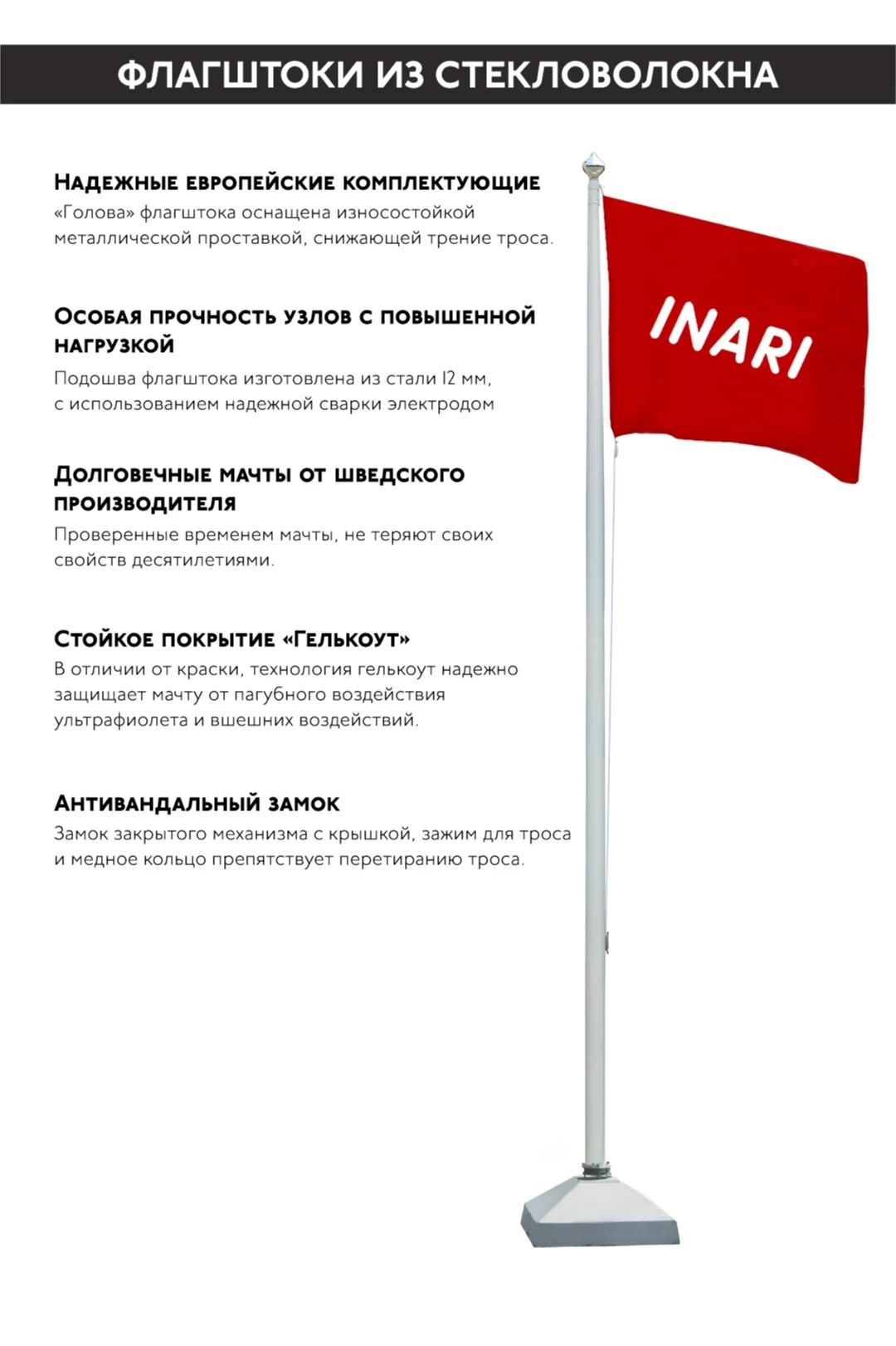 Флагштоки из стекловолокна отличаются своей надежностью. Материал стекловолокно не подвержен коррозии, так как нанесен гелькоут для декоративно-защитного покрытия флагштока. Данная технология позволяет флагштоку длительное время сохранять свой первозданный товарный вид. Флагштоки из стекловолокна не деформируются под воздействием даже постоянных ветровых нагрузок. Стекловолокно не является проводником, что делает его использование безопасным во время грозы даже в отсутствие громоотвода.
