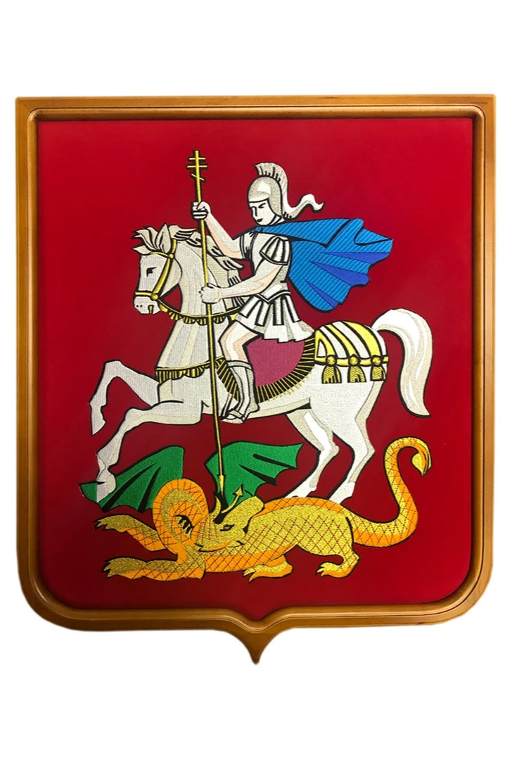 Герб Московской области с вышивкой - отличный предмет интерьера для украшения кабинета, а так же прекрасный подарок для чиновника или руководителя столичной организации.