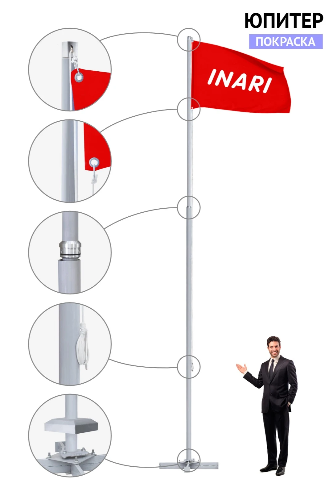 Комплектация флагштока из алюминия с открытым механизмом: