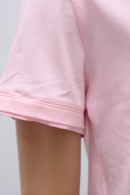 Модель. Прямой силуэт. Рукав короткий. К нижней части рукава пришивается декоративная вставка в цвет футболки или другого цвета. Футболка имеет боковые швы без разрезов по низу изделия. Обработка горловины руликом (кантом) из основной ткани в цвет футболки. Форма ворота О-образная.