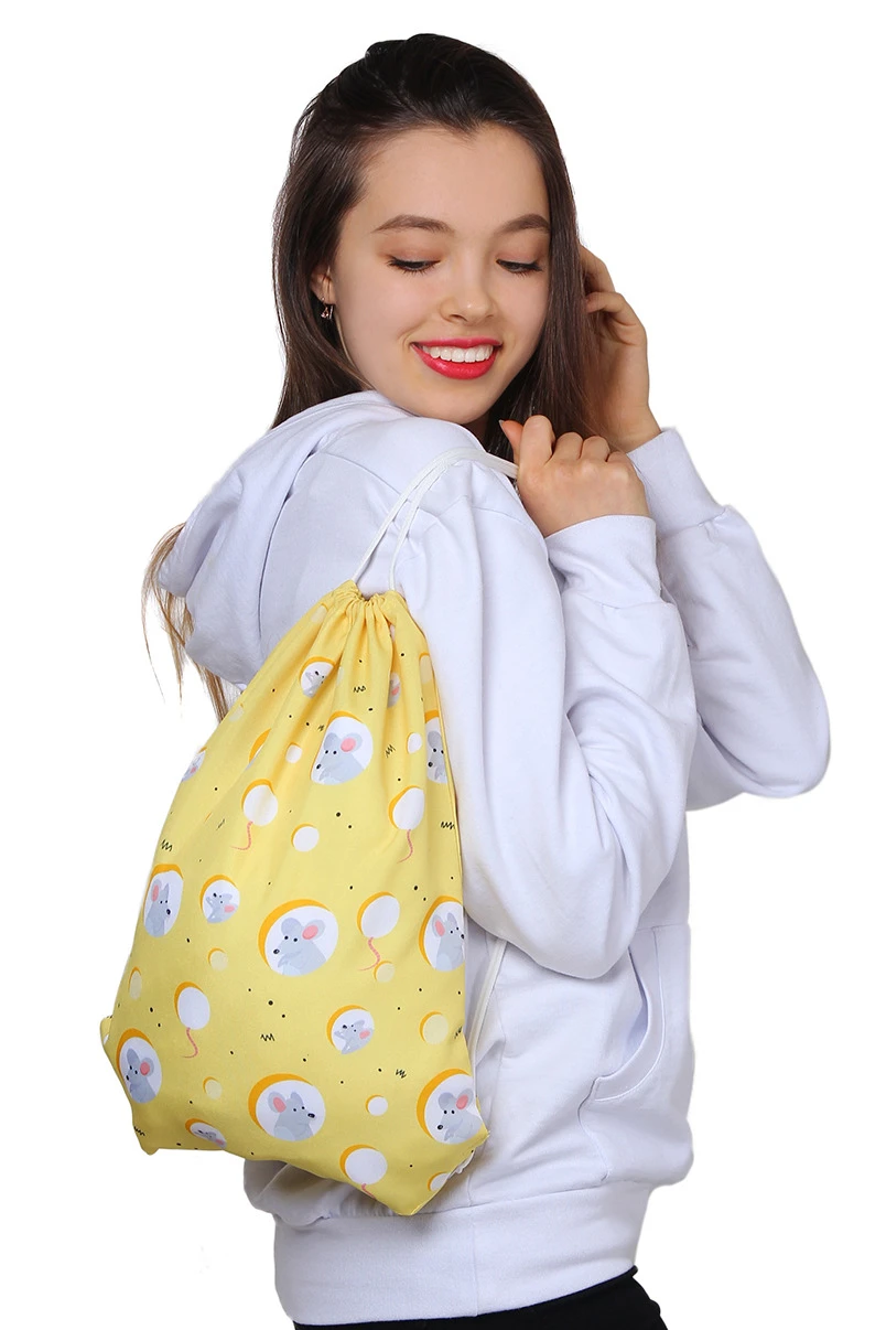 Модель. Рюкзак плоский прямоугольной формы. Верхний край рюкзаков обрабатывается прошивкой. Лямки-завязки выполняются из шнура стандартных цветов, который закрепляется в кулиске по верхнему краю и в люверсах по нижним углам рюкзака.