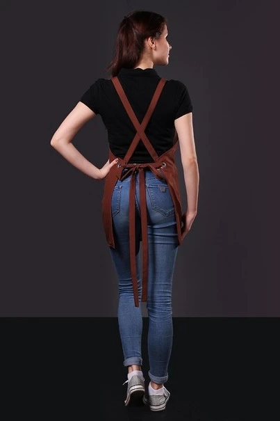 Модель: Фартук фигурной формы без разреза. Фартук по периметру обработан швом вподгибку. Фартук изготовлен с тремя карманами: два боковых 18х20 см и один карман на груди 13х12 см. Креплением служат перекрещивающиеся на спине лямки. Лямки из основной ткани фиксируются на груди с помощью двух пластиковых регуляторов черного цвета. В районе пояса лямки продеваются через два никелированных люверса диаметром 15 мм.