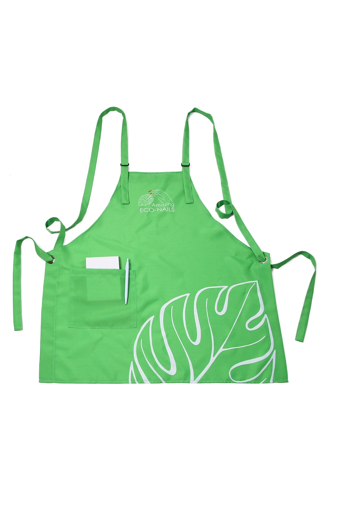 Модель: Фартук фигурной формы без разреза. Фартук по периметру обработан швом вподгибку. Фартук изготовлен с одним карманом 18х70 см, разделенным на 6 отсеков. Креплением служат перекрещивающиеся на спине лямки. Лямки из основной ткани фиксируются на груди с помощью двух пластиковых регуляторов черного цвета. В районе пояса лямки продеваются через два никелированных люверса диаметром 15 мм.