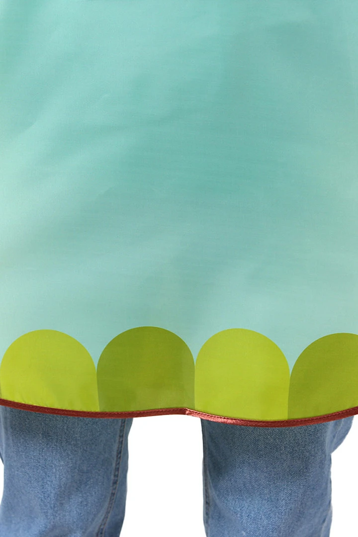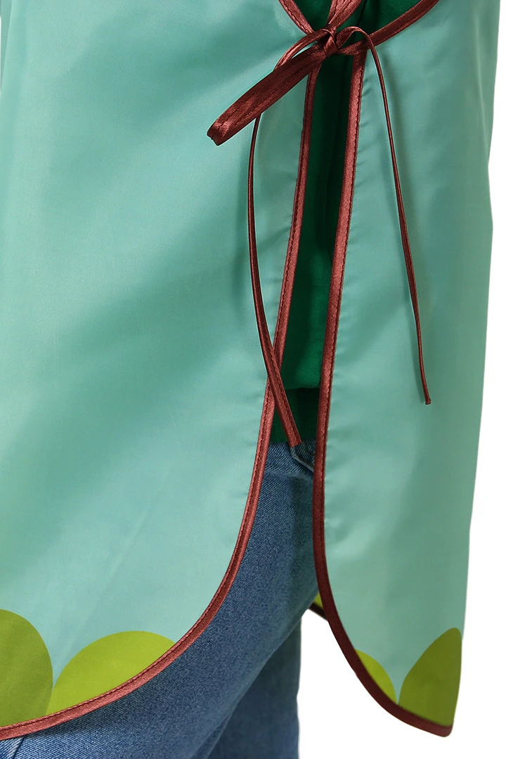 Модель: Накидка фигурной формы без карманов. За дополнительную плату фартук-накидка может быть пошит с одним карманом 20х25 см, либо двумя карманами 13х16 см. Края и горловина фартука обрабатываются косой бейкой стандартных цветов. Завязки длиной 50 см, выполнены из косой бейки.
