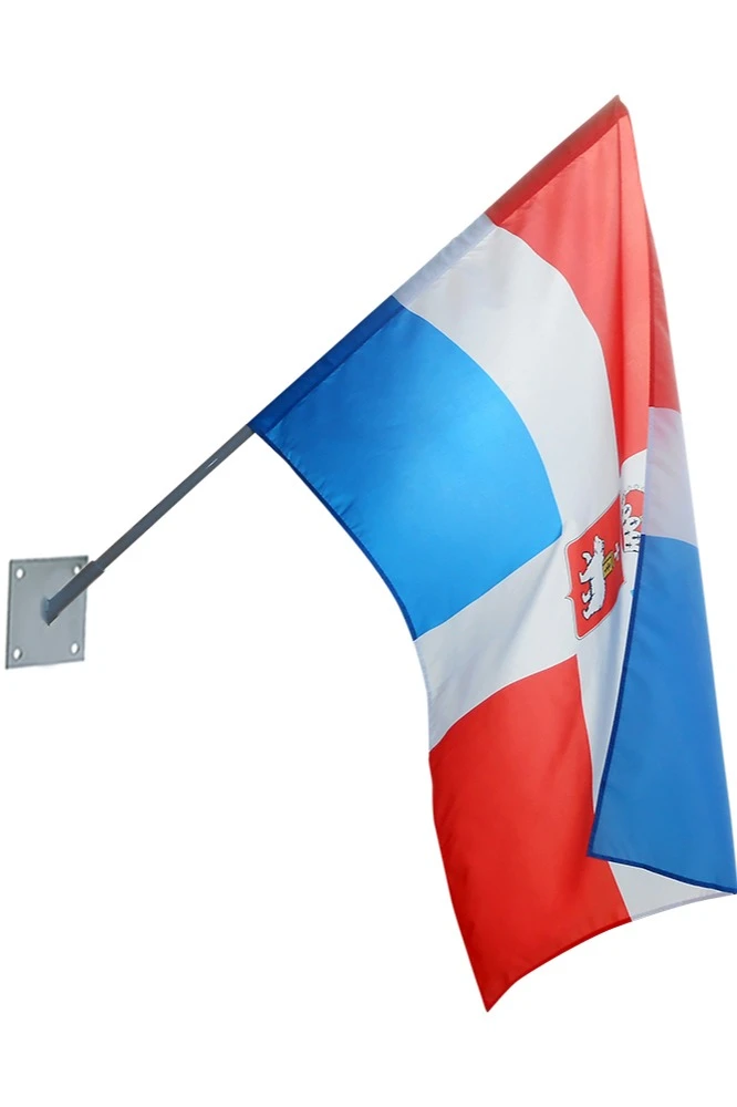 Настенный металлический кронштейн – недорогое и практичное приспособление для вывешивания флага на улице. Настенный кронштейн, как правило, устанавливается на фасад здания. Для некоторых организаций и учреждений установка уличного фасадного кронштейна с флагами является обязательной, особенно во время государственных праздников. Кронштейн легко и надёжно устанавливается, и так же легко заменяются флаги на нём.