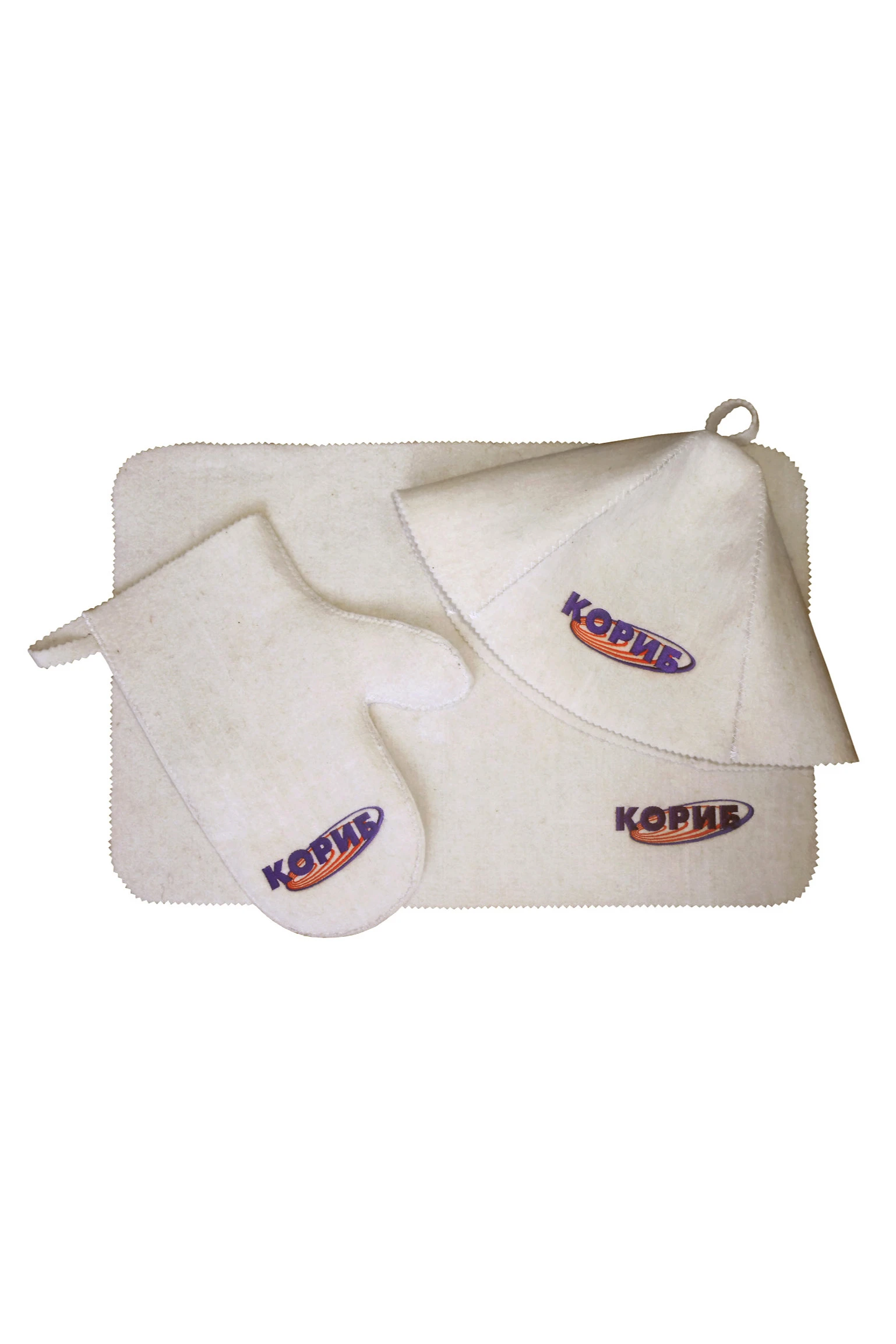 Размер: шапка Банщик (высота шапки 23 см, диаметр 32 см; высота клина 23 см, ширина 18 см (самая широкая часть)), Рукавица (29х14 см (29х22 см с учетом большого пальца)), Коврик (50х33 см).