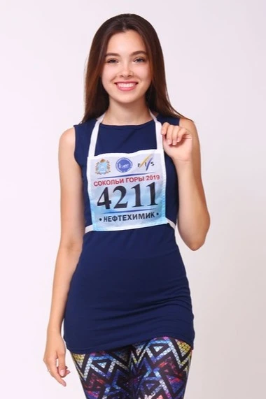 Модель: Стартовый номер прямоугольной формы, состоит из одного слоя ткани. Располагается на груди. Расположение номеров может быть как горизонтальным, так и вертикальным. Креплением служит шейная петля и завязки, выполненные из брючной ленты белого или черного цветов. Длина шейной петли 60 см, длина завязок 50 см.