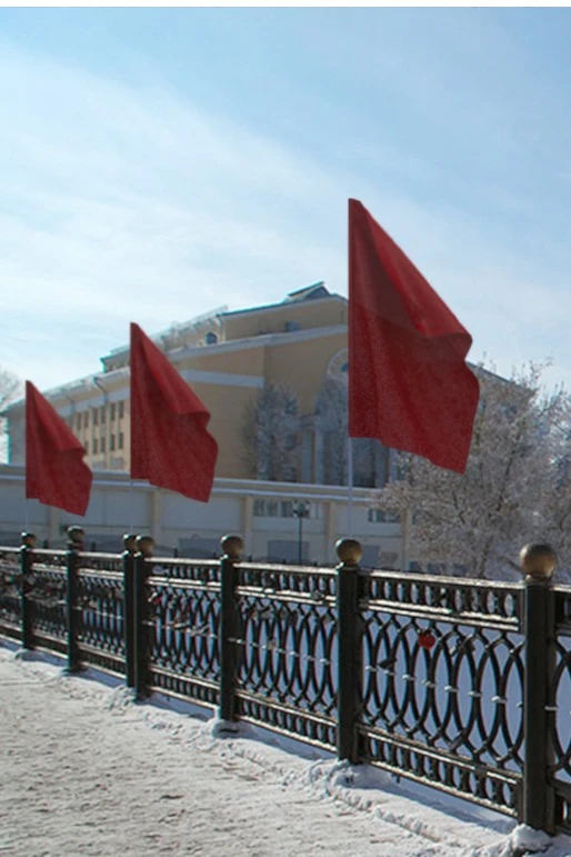 Материал: шелк расцвечивания стандартных цветов, за дополнительную плату флаг может быть изготовлен из ткани оксфорд 210D (100% полиэстер, плотность 90 гр./м²) стандартных цветов.