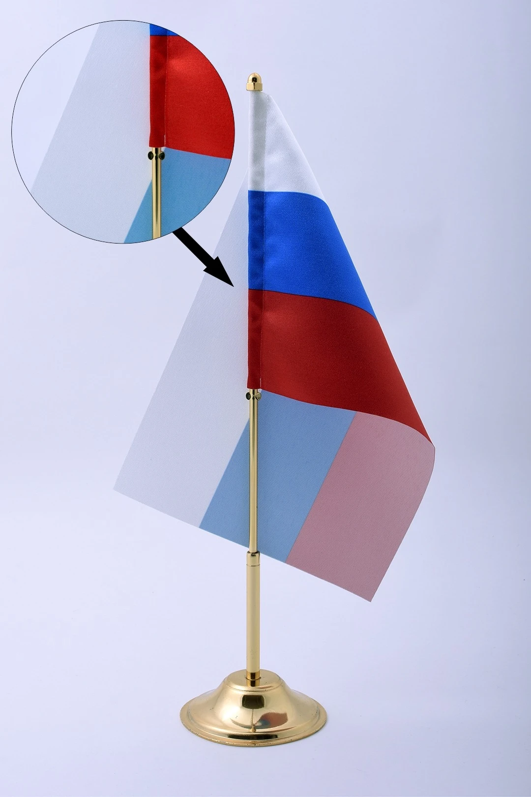 Флажок из атласа изготавливается из одного слоя, либо двух слоев ткани склеенными между собой. Нанесение выполнено методом сублимации.