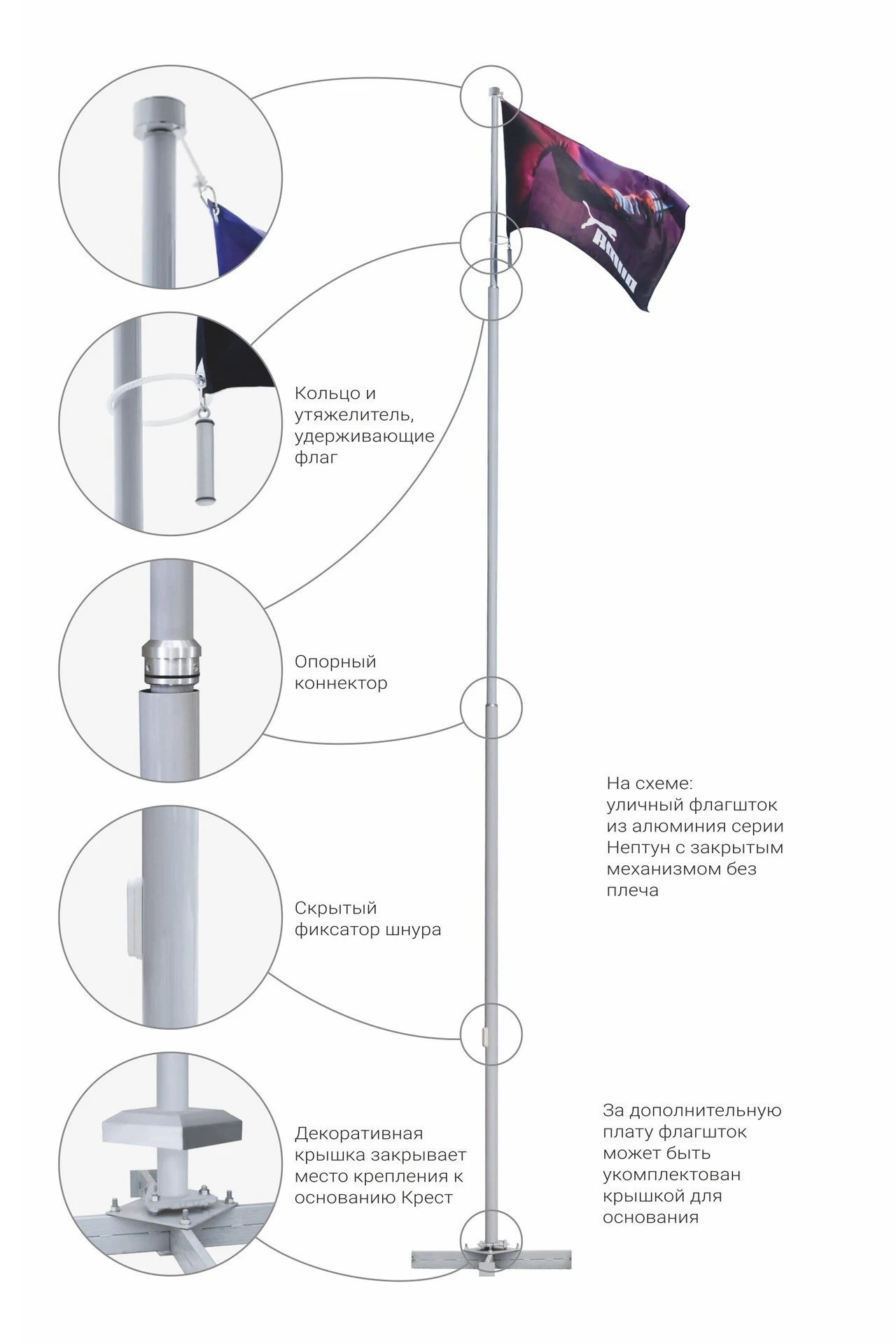 Флагштоки с закрытым механизмом – наиболее эстетичный вариант флагштока для вертикального или горизонтального флага. Флагшток с закрытым подъёмным механизмом не исключает его эксплуатацию с баннерным плечом баннер-лифт, однако он не входит в комплектацию такого вида флагштока изначально. Флагштоки с закрытым механизмом могут быть использованы на открытых территориях, т.к. оснащены замком, скрывающим доступ к подъёмному механизму от посторонних лиц.