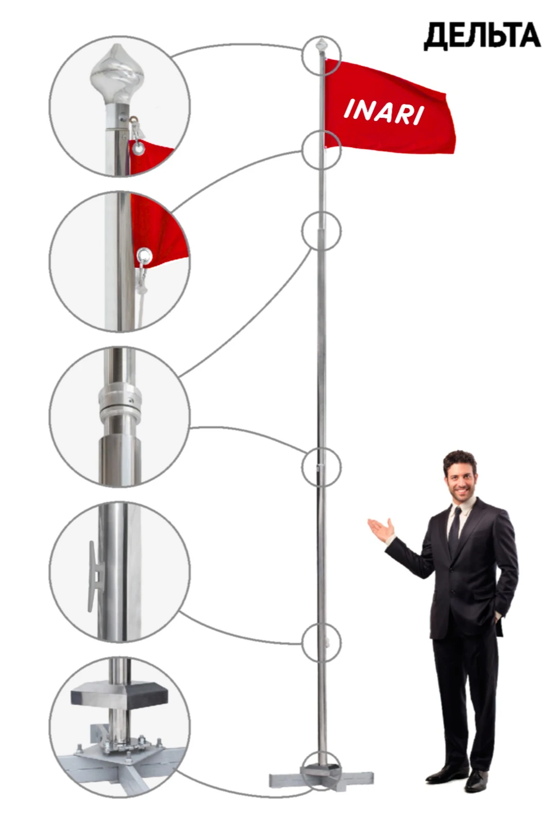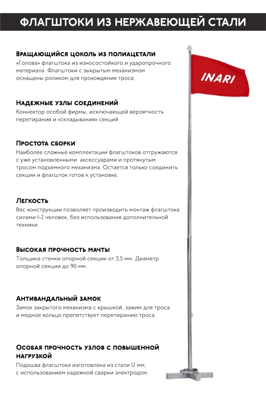 Флагшток из нержавеющей стали отличается прочностью, долговечностью и презентабельным внешним видом (благодаря зеркальной матовой поверхности). Флагшток устойчив к воздействию различных погодных условий, не ломается под порывами ветра, прост в эксплуатации и не требует тщательного ухода после установки. Флагшток от "Инари" собирается быстро и легко. В отличие от цельных конструкций флагштоков из нержавеющей стали, он имеет большую мобильность, поскольку состоит из нескольких секций. Флагштоки изготавливаются из нержавеющей стали AISI 304.