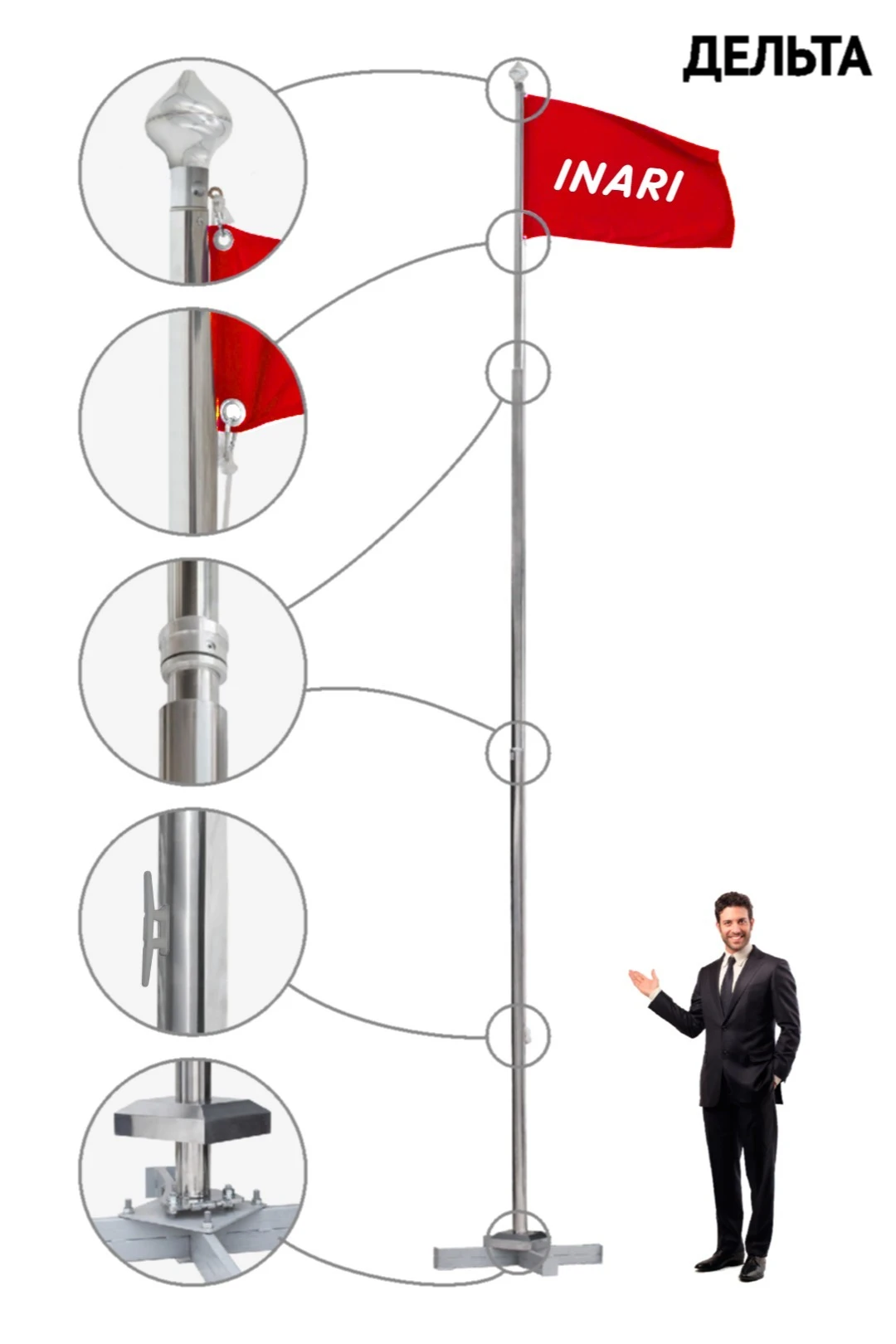 Флагшток из нержавеющей стали отличается прочностью, долговечностью и презентабельным внешним видом (благодаря зеркальной матовой поверхности). Флагшток устойчив к воздействию различных погодных условий, не ломается под порывами ветра, прост в эксплуатации и не требует тщательного ухода после установки. Флагшток от "Инари" собирается быстро и легко. В отличие от цельных конструкций флагштоков из нержавеющей стали, он имеет большую мобильность, поскольку состоит из нескольких секций. Флагштоки изготавливаются из нержавеющей стали AISI 304.