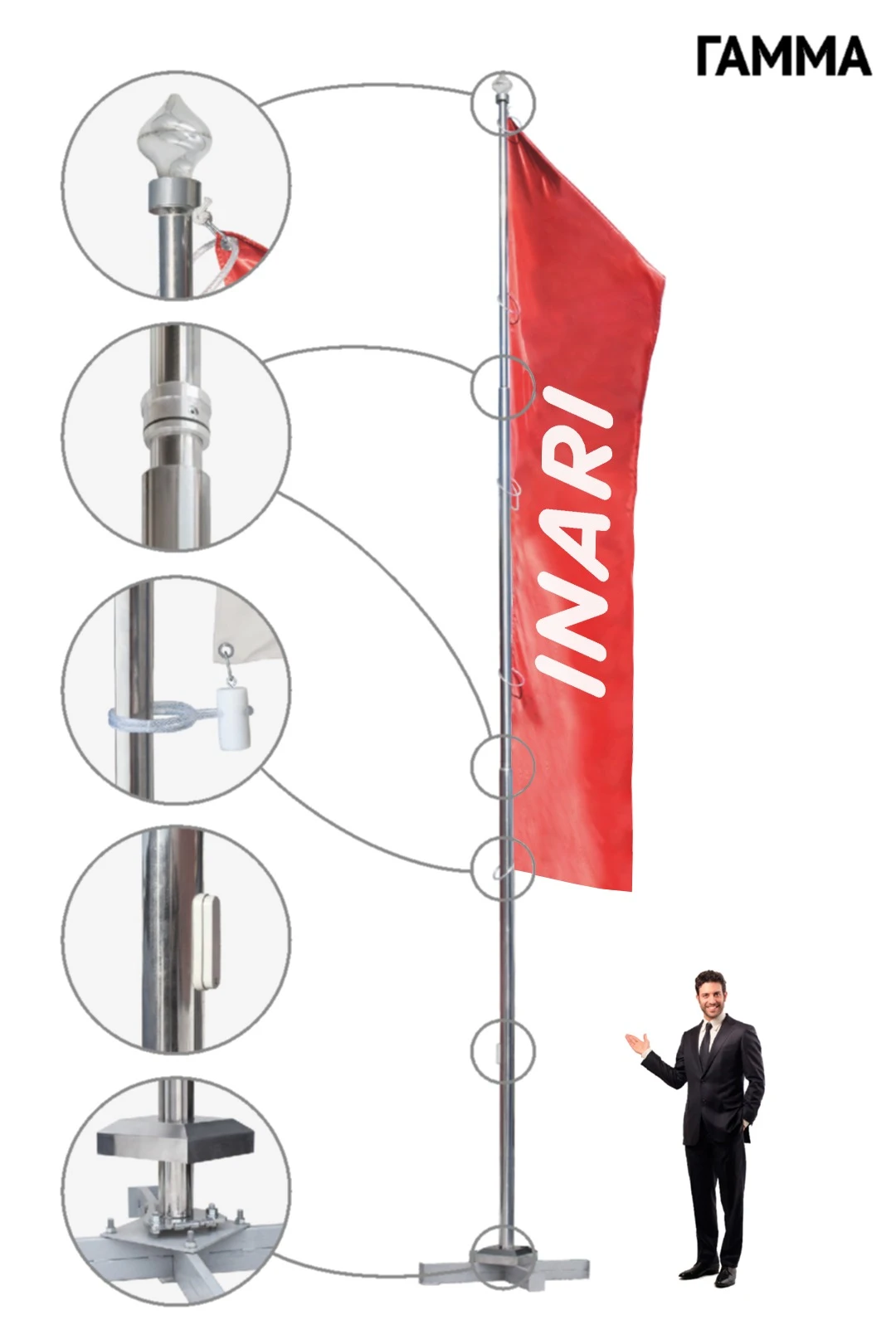 Флагшток из нержавеющей стали отличается прочностью, долговечностью и презентабельным внешним видом (благодаря зеркальной матовой поверхности). Флагшток устойчив к воздействию различных погодных условий, не ломается под порывами ветра, прост в эксплуатации и не требует тщательного ухода после установки. Флагшток от "Инари" собирается быстро и легко. В отличие от цельных конструкций флагштоков из нержавеющей стали, он имеет большую мобильность, поскольку состоит из нескольких секций. Флагштоки изготавливаются из нержавеющей стали AISI 304.