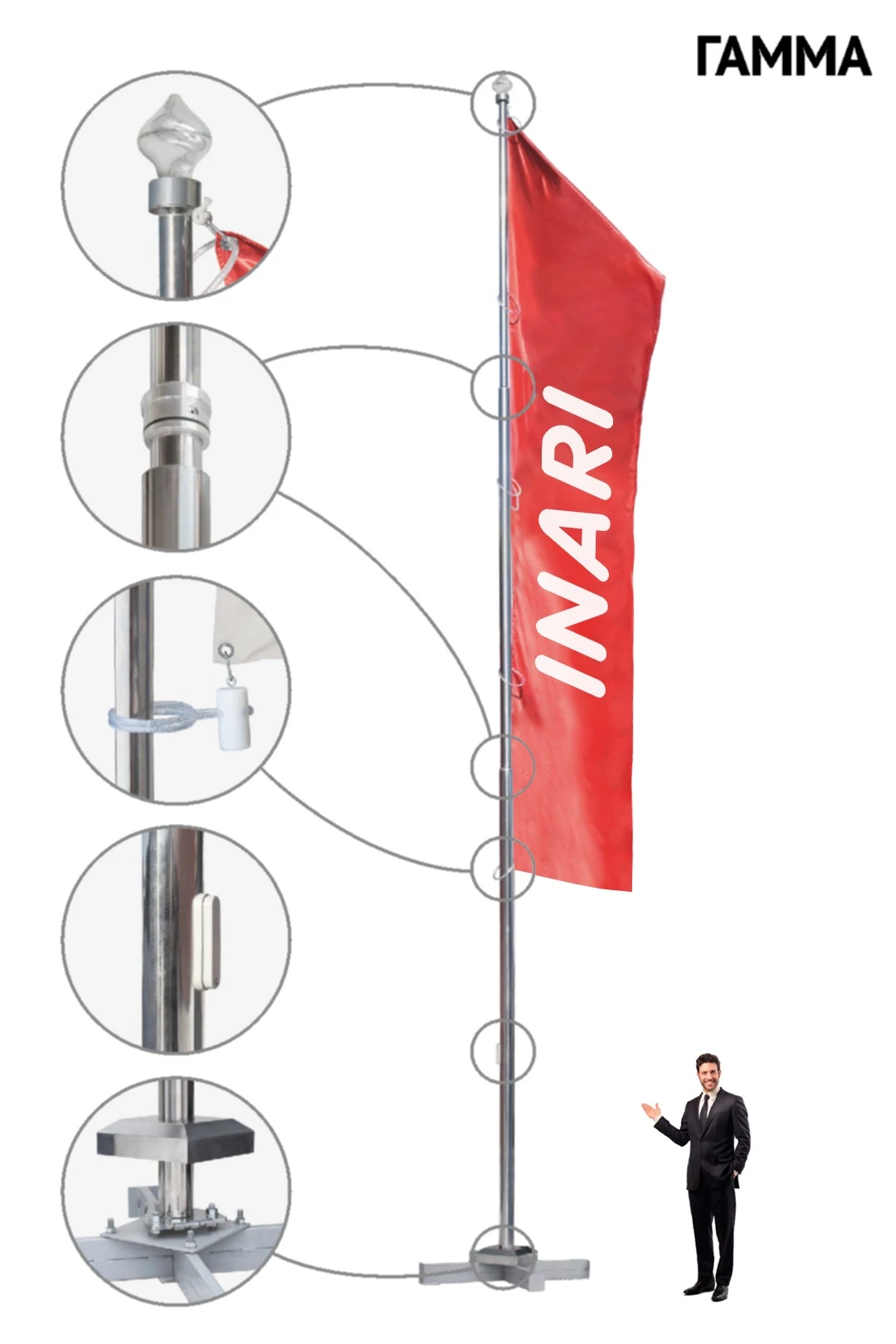 Флагшток из нержавеющей стали отличается прочностью, долговечностью и презентабельным внешним видом (благодаря зеркальной матовой поверхности). Флагшток устойчив к воздействию различных погодных условий, не ломается под порывами ветра, прост в эксплуатации и не требует тщательного ухода после установки. Флагшток от "Инари" собирается быстро и легко. В отличие от цельных конструкций флагштоков из нержавеющей стали, он имеет большую мобильность, поскольку состоит из нескольких секций. Флагштоки изготавливаются из нержавеющей стали AISI 304.