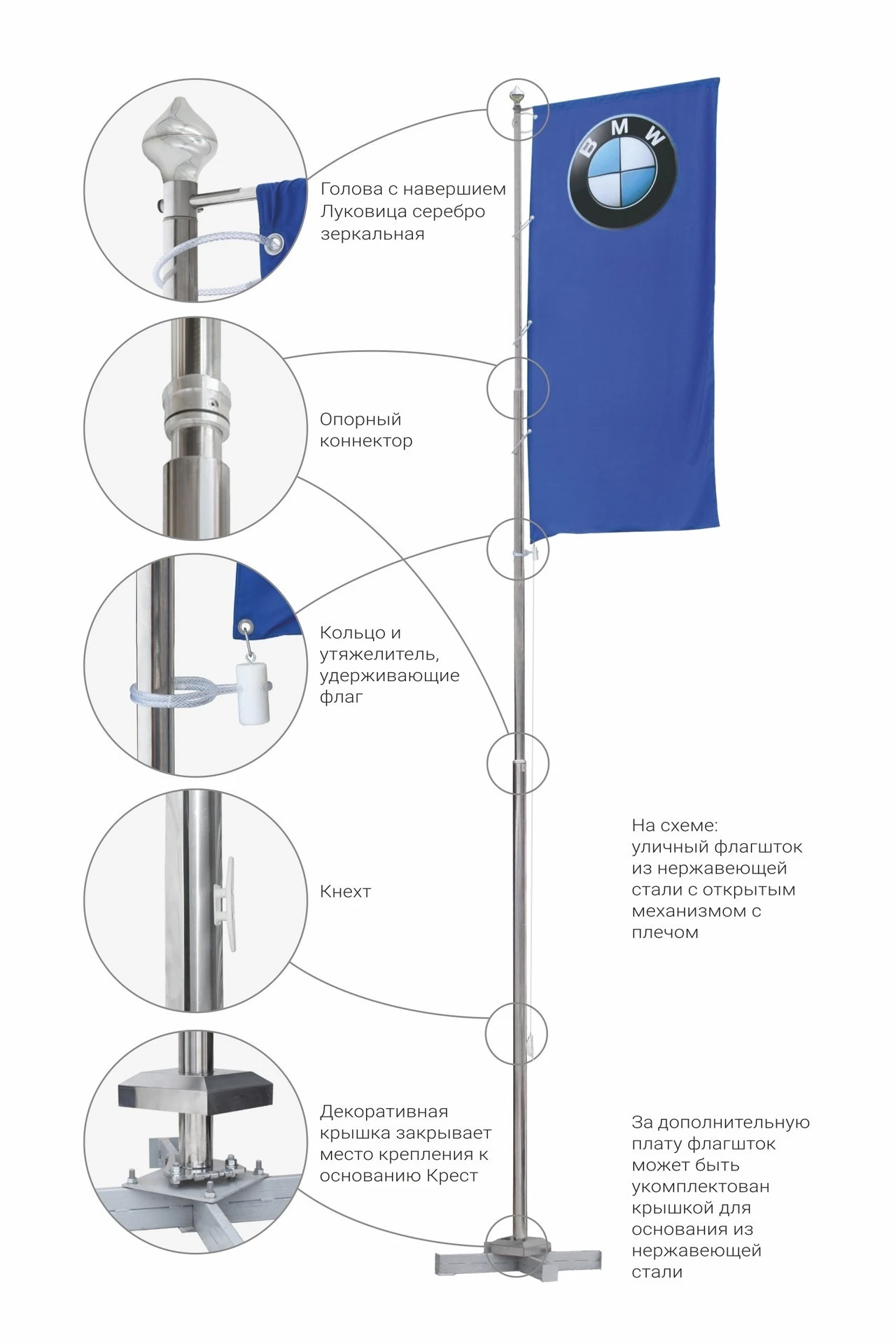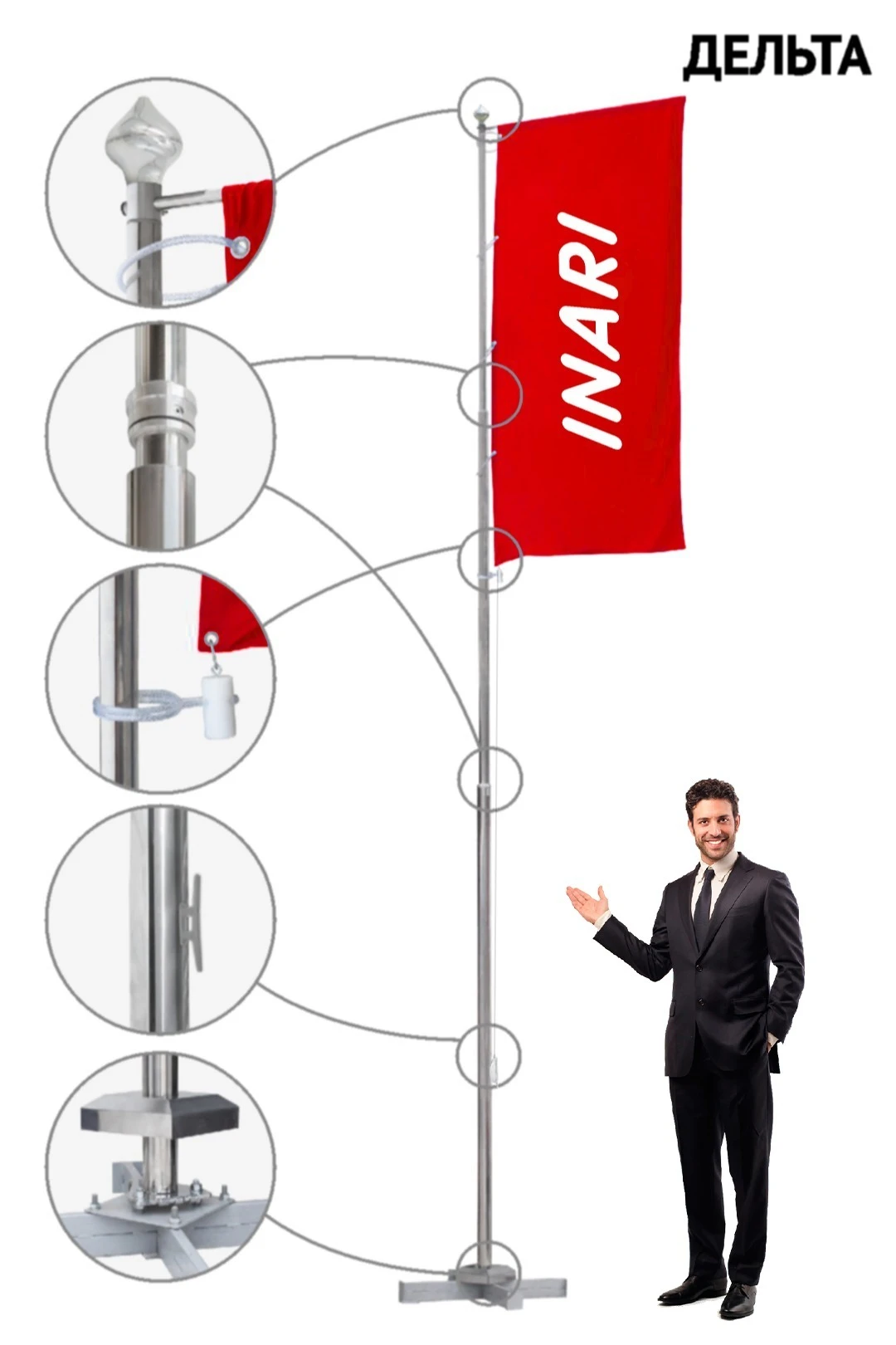 Флагшток из нержавеющей стали отличается прочностью, долговечностью и презентабельным внешним видом (благодаря зеркальной матовой поверхности). Флагшток устойчив к воздействию различных погодных условий, не ломается под порывами ветра, прост в эксплуатации и не требует тщательного ухода после установки. Флагшток от "Инари" собирается быстро и легко. В отличие от цельных конструкций флагштоков из нержавеющей стали, он имеет большую мобильность, поскольку состоит из нескольких секций. Флагштоки изготавливаются из нержавеющей стали AISI 304.