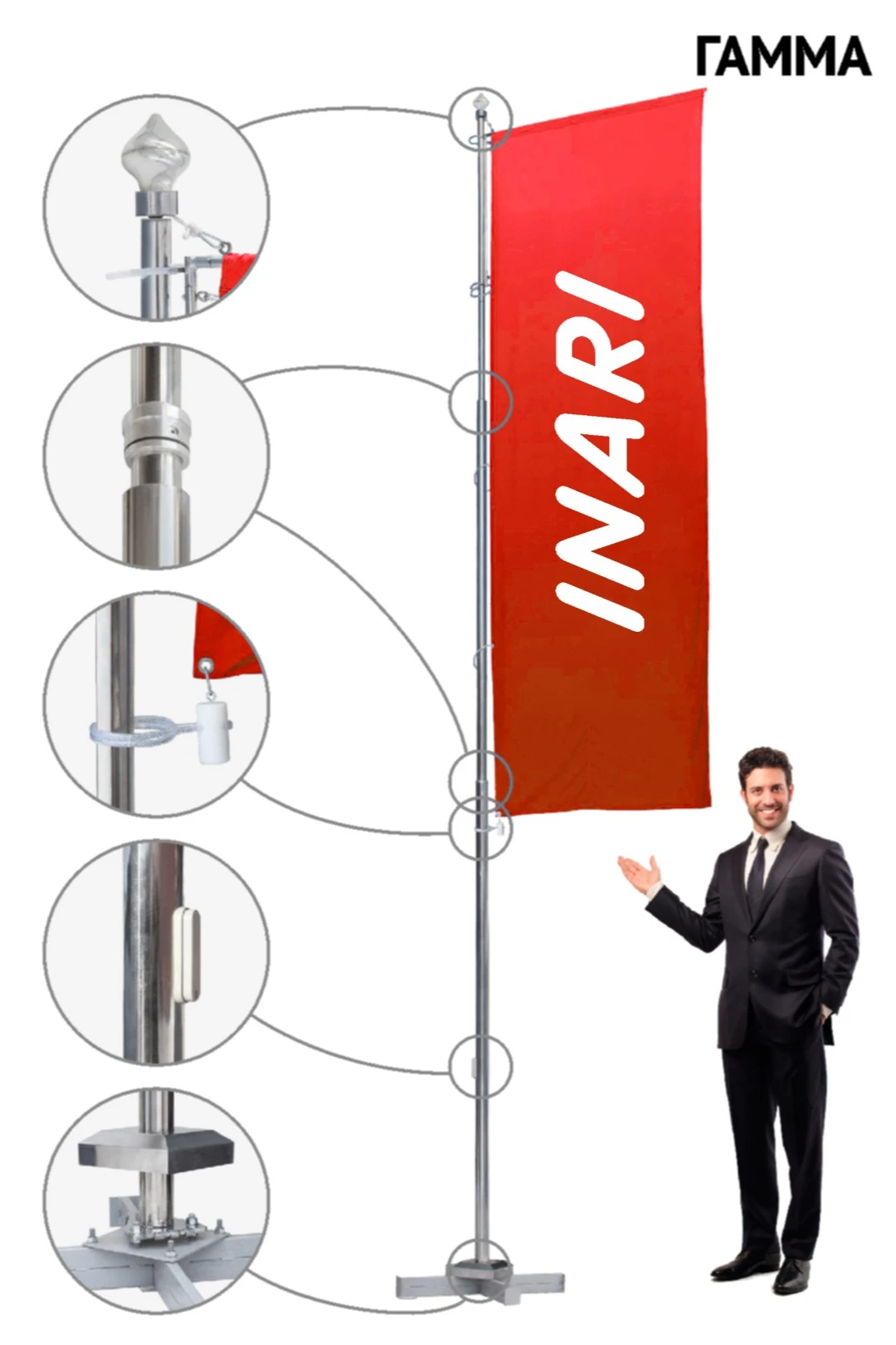 Флагшток из нержавеющей стали отличается прочностью, долговечностью и презентабельным внешним видом (благодаря зеркальной матовой поверхности). Флагшток устойчив к воздействию различных погодных условий, не ломается под порывами ветра, прост в эксплуатации и не требует тщательного ухода после установки. Флагшток от "Инари" собирается быстро и легко. В отличие от цельных конструкций флагштоков из нержавеющей стали, он имеет большую мобильность, поскольку состоит из нескольких секций. Флагштоки изготавливаются из нержавеющей стали AISI 304.