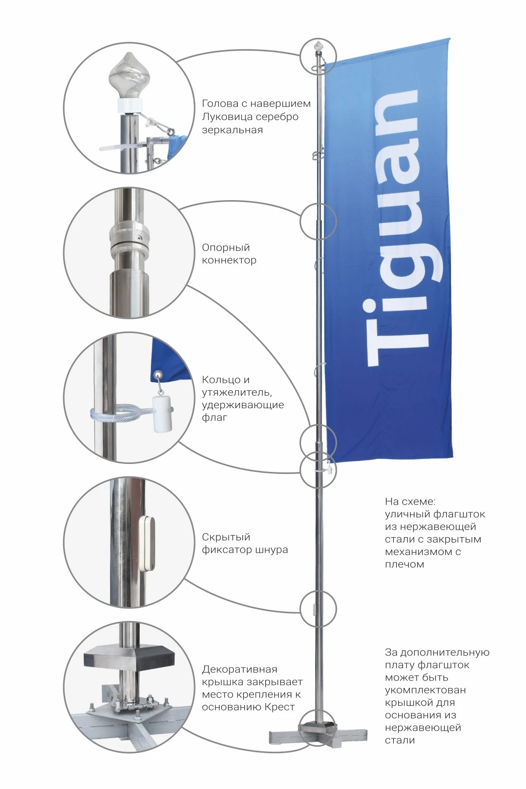 За дополнительную плату флагшток может быть укомплектован крышкой для основания из нержавеющей стали размером 29х29х8,5 см.