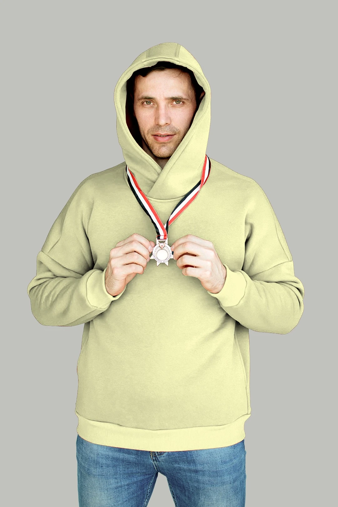 Модель. Худи Кинг прямого силуэта, без молнии. Длинные рукава со спущенной линией плеч. Имеет два кармана в боковом шве. Низ толстовки и рукавов обработаны тканью кашкорсе (специальная тканая резинка) в цвет толстовки. Капюшон пришивной двухслойный.