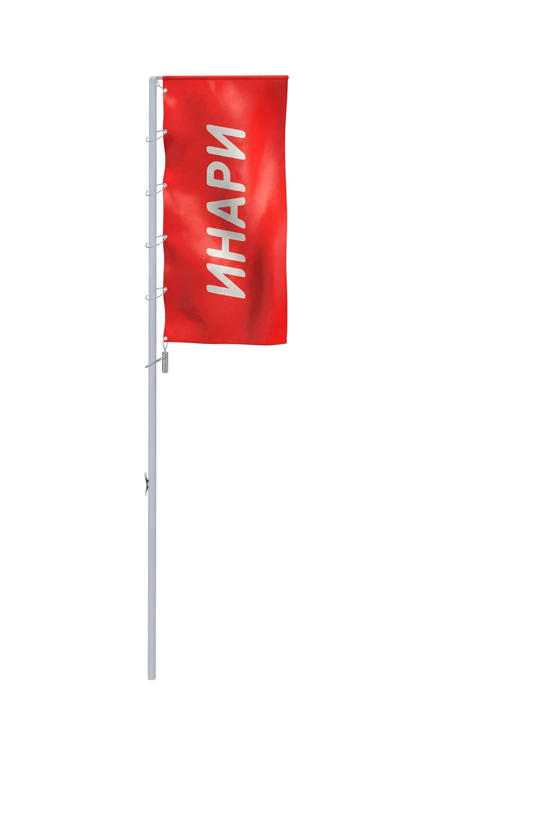2) Вертикальный флаг крепится на плечо с помощью глухого кармана сверху шириной 3,5 см в сложенном виде. Вдоль флагштока флаг удерживается с помощью колец, продетых в люверсы. На нижнем крае флага прошивается петля для крепления утяжелителя.