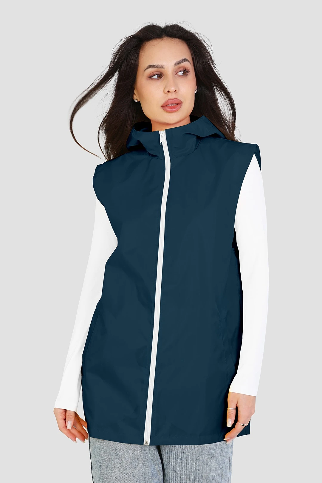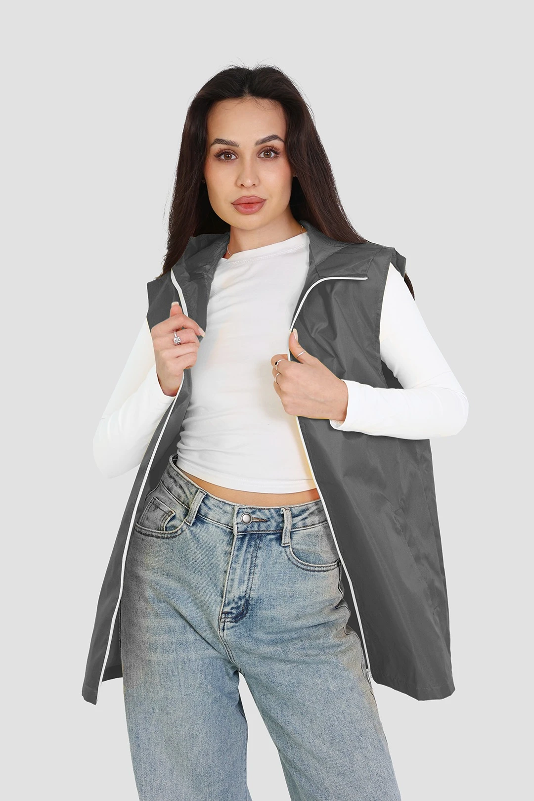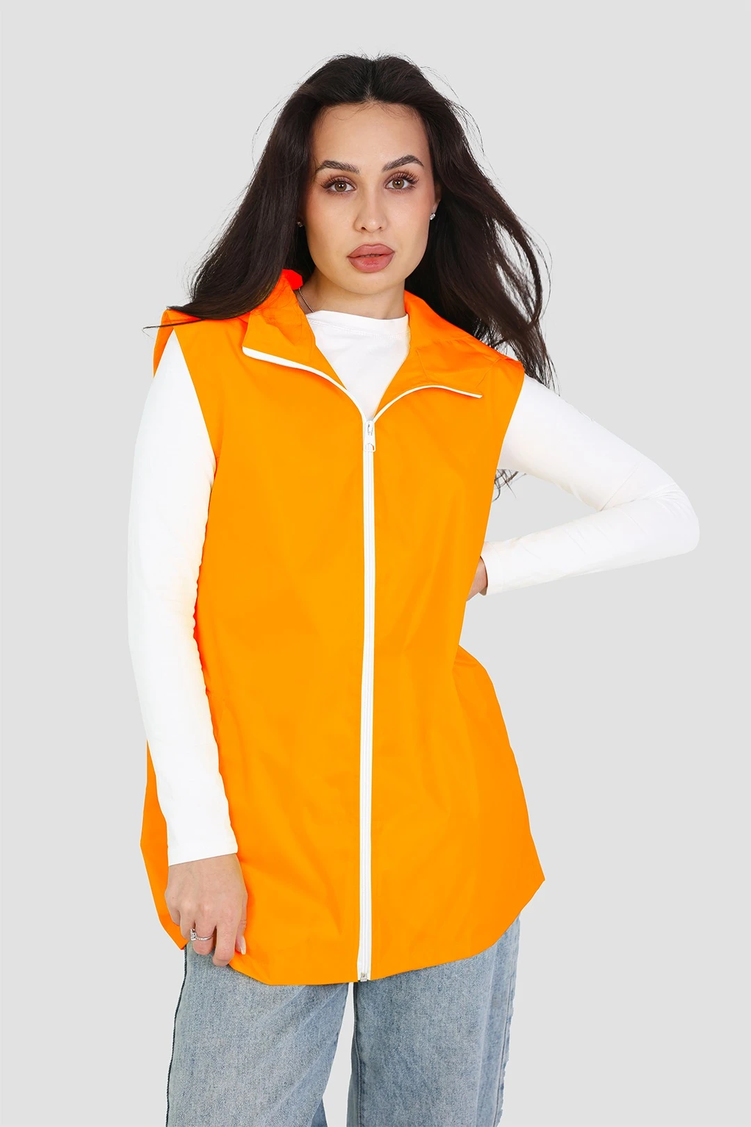 Модель. Жилет Профи унисекс с прямым силуэтом. Капюшон пришивной, на верхней части у края капюшона пришита резинка для удобства. Два прорезных кармана в листочку. Застегивается на молнию, Жилет без стежки с подкладом из шелка расцвечивания.