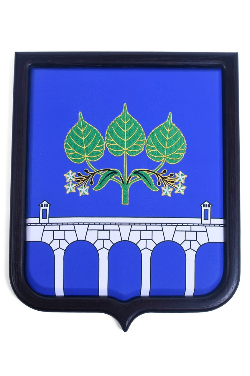 Форма, размер: Герб имеет форму французского щита размером 35х43 см. На оборотной стороне имеется крепление петля металлическая для подвешивания герба на стену.