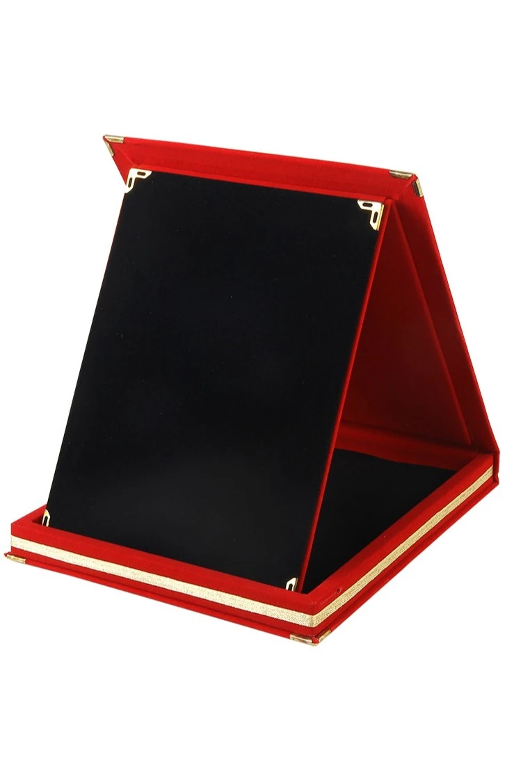 Материал: Футляр изготовлен из флокированной замши красного или синего цвета, и имеет металлическую фурнитуру. Плакетка внутри футляра обтянута черным бархатом и по углам стоят декоративные металлические узоры.