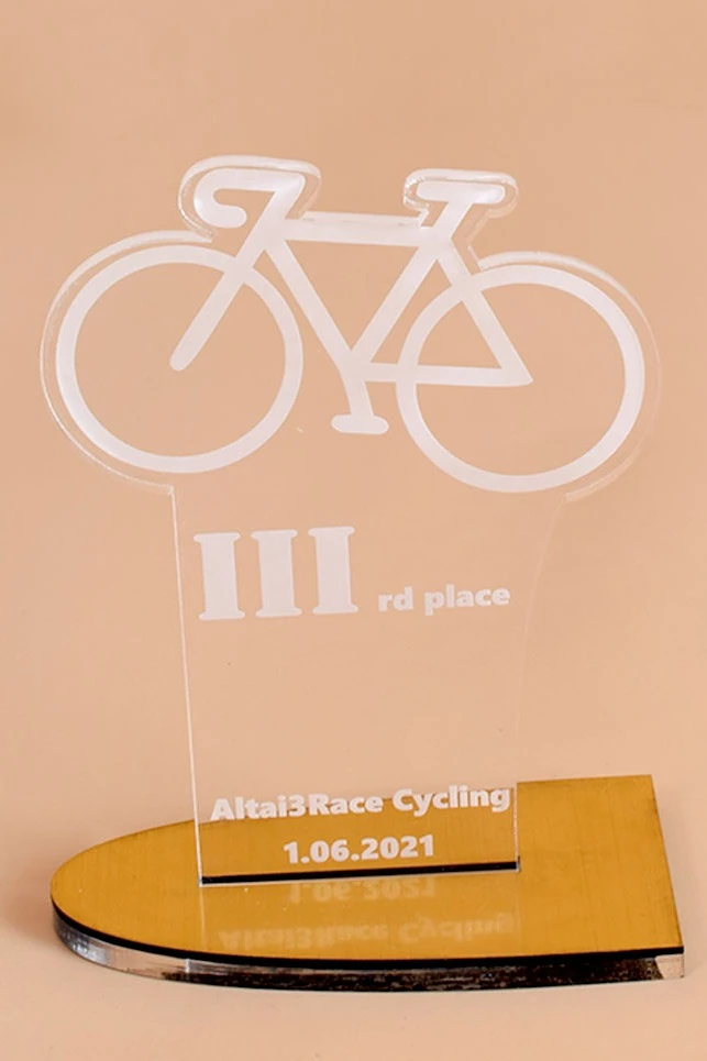 Материал: фигура - прозрачный акрил толщиной 5 мм, основание - акрил толщиной 5 мм с золотым либо серебряным пластиком толщиной 1,5мм.
