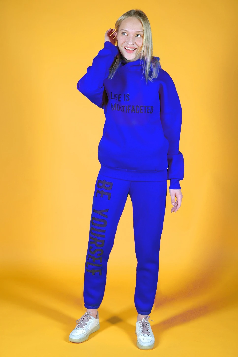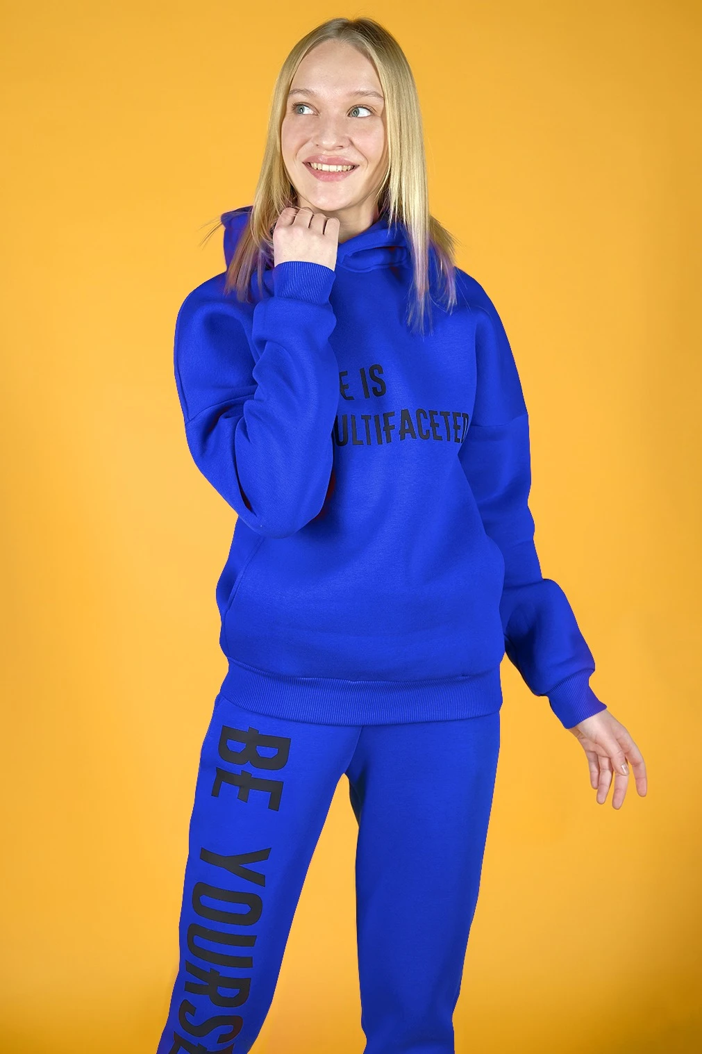 Модель. Худи Кинг прямого силуэта, без молнии. Длинные рукава со спущенной линией плеч. Имеет два кармана в боковом шве. Низ толстовки и рукавов обработаны тканью кашкорсе (специальная тканая резинка) в цвет толстовки. Капюшон пришивной двухслойный.
