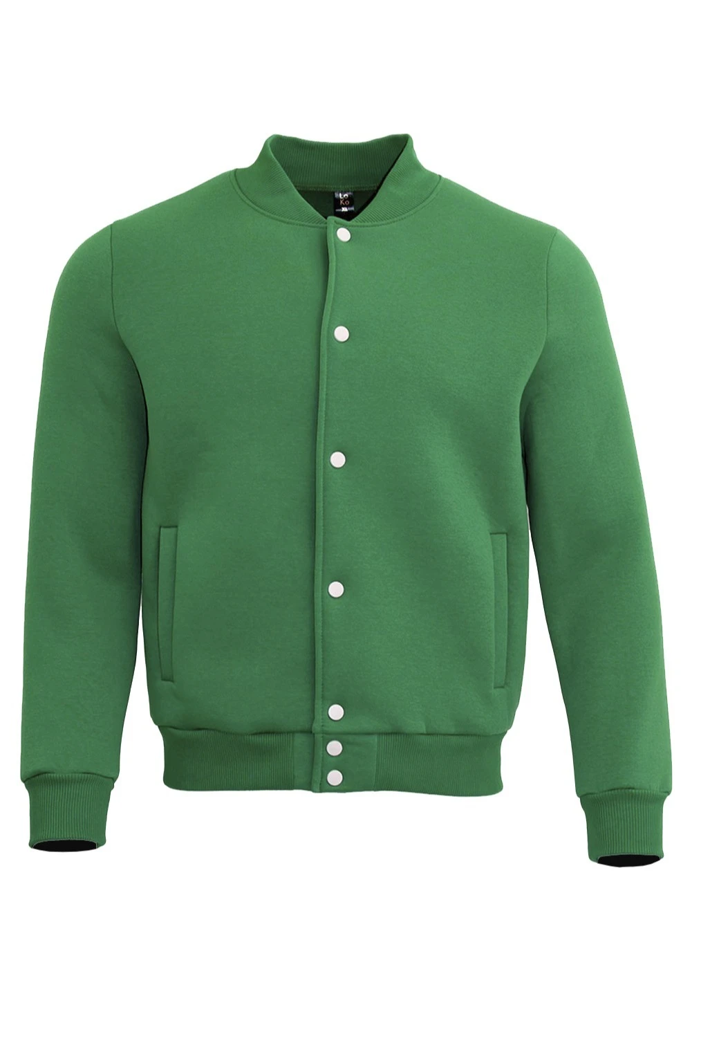 Модель. Бомбер прямого силуэта, без капюшона. Длинные рукава с манжетами из ткани футер с начесом. Низ бомбера и рукавов, а также воротник с закругленными углами выполнены из кашкорсе (специальная тканная резинка) в цвет изделия. Бомбер застегивается на семь кнопок. Имеет два боковых кармана в листочку без молнии.